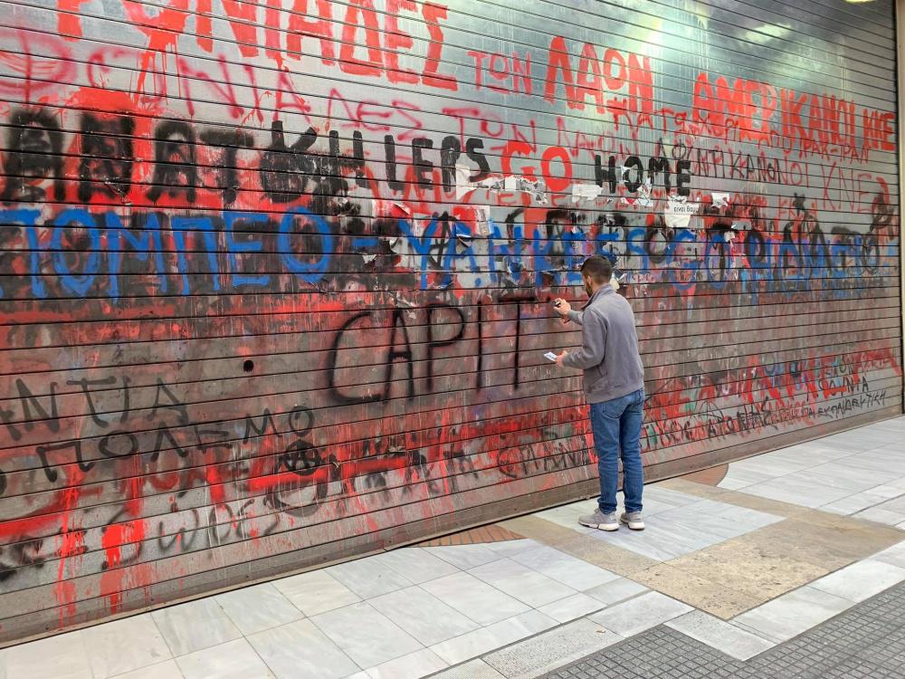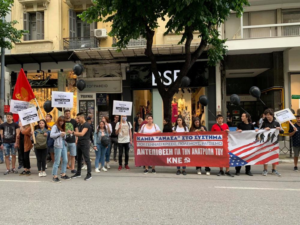 Συγκέντρωση μπροστά από το προξενείο των ΗΠΑ, με αφορμή όσα συμβαίνουν στην Μινεάπολη των ΗΠΑ πραγματοποίησαν μέλη της ΚΝΕ. Οι διαδηλωτές πραγματοποίησαν πορεία στο κέντρο της Θεσσαλονίκης, ενώ νωρίτερα άφησαν μαύρα μπαλόνια στον ουρανό της πόλης και έγραψαν συνθήματα έξω από το εμπορικό κέντρο πλατεία όπου στεγάζεται το Αμερικανικό προξενείο στη Θεσσαλονίκη.