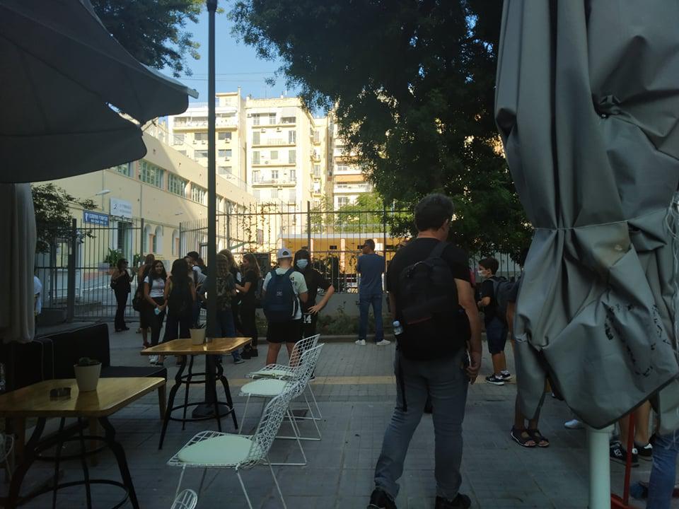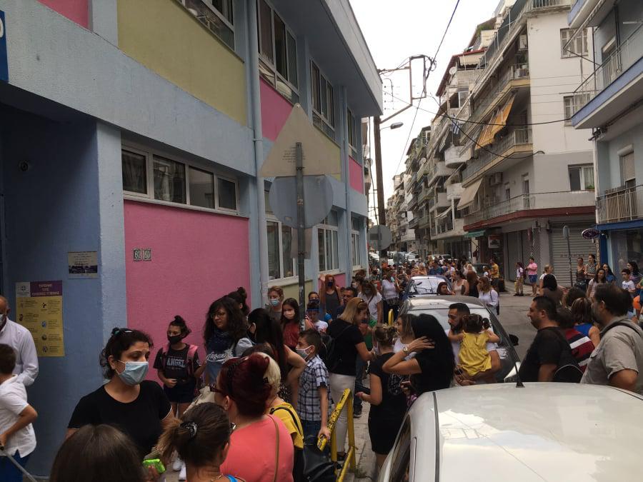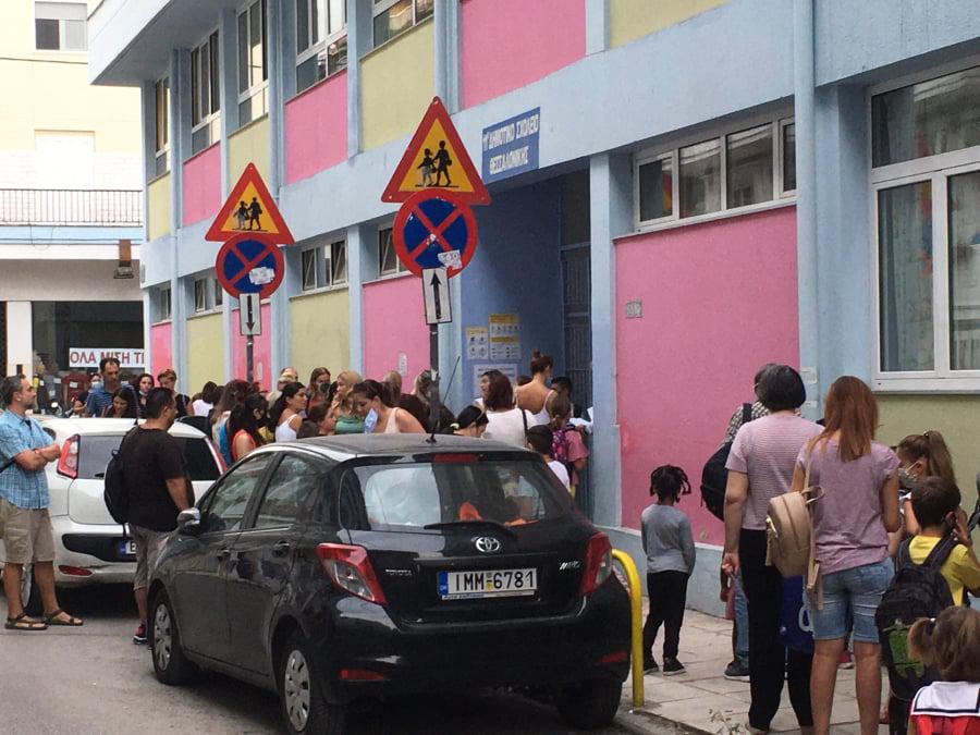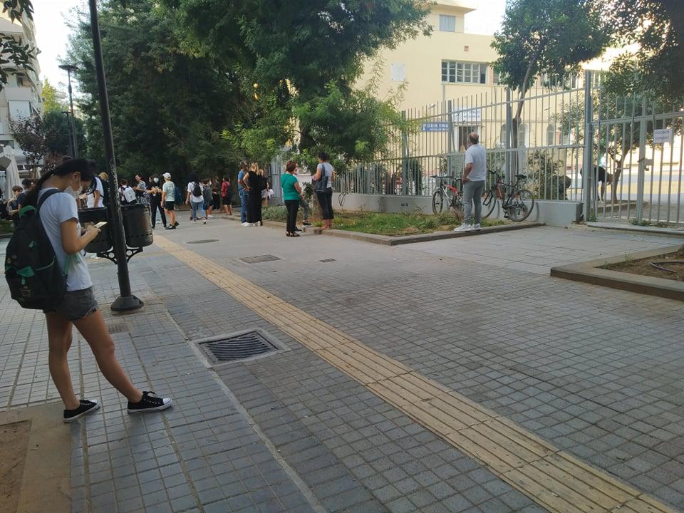 Πρώτη μέρα στο σχολείο, κάτω από νέα μέτρα προστασίας για τον περιορισμό διασποράς του κοροναϊού. Παιδιά περιμένουν υπομονετικά εκτός προαυλίου με τις μάσκες και τα αντισηπτικά. Ενώ άλλα βρίσκονται ήδη εντός για το πρώτο κουδούνι της χρονιάς.