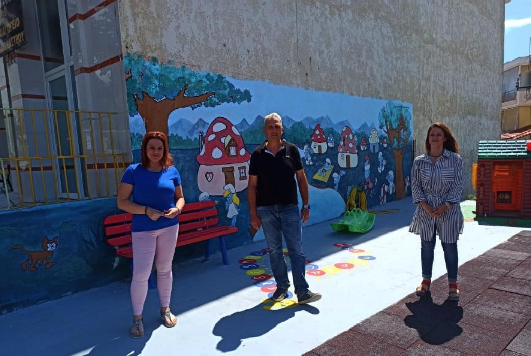 Χάρη στη διαχρονική συνεργασία μεταξύ του Συλλόγου Γονέων και της Πρωτοβάθμιας Σχολικής Επιτροπής του δήμου Ωραιοκάστρου το προαύλιο του Νηπιαγωγείου άλλαξε όψη. «Σε έναν τοίχο ζωγραφίσαμε μορφές από τα Στρουμφάκια, εγκαταστήσαμε παιχνίδια, τοποθετήσαμε παγκάκια και διαμορφώσαμε το δάπεδο, ώστε τα παιδιά να παίζουν με ασφάλεια σε έναν όμορφο χώρο. Πραγματικά το χαίρονται και μαζί τους χαιρόμαστε και εμείς», τονίζει ο πρόεδρος της Πρωτοβάθμιας Σχολικής Επιτροπής του δήμου Ωραιοκάστρου, Ευάγγελος Χατζηαντωνίου.