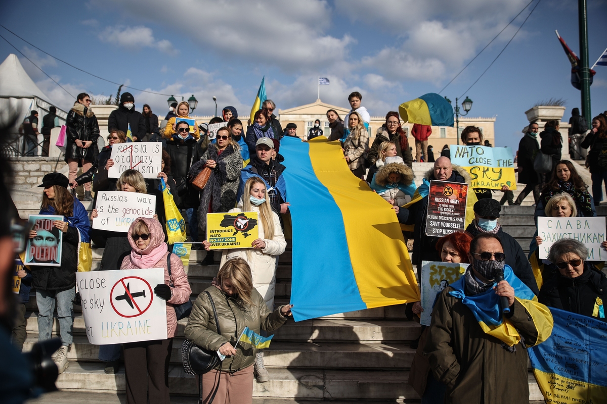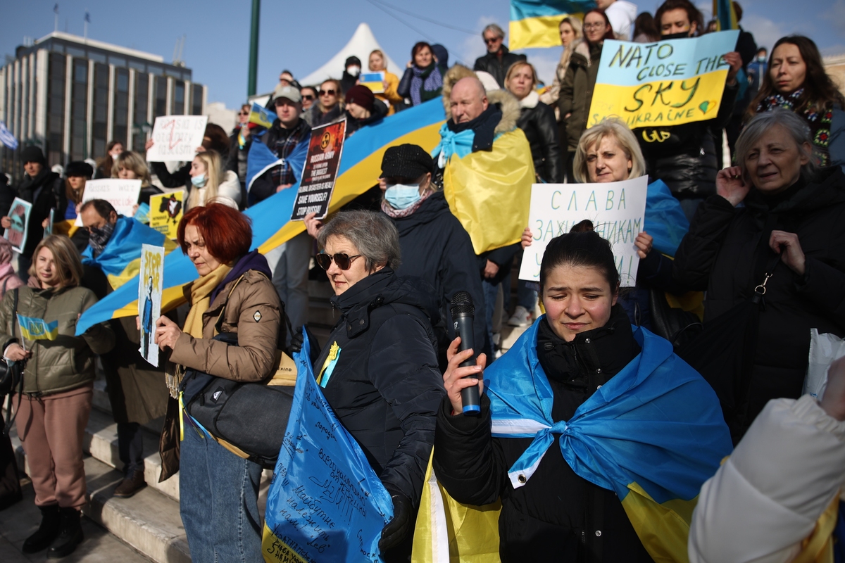 Άνδρες και γυναίκες από την Ουκρανία που ζουν στην Ελλάδα καθώς και αλληλέγγυοι συγκεντρώθηκαν λίγο μετά τις 4 μετά το μεσημέρι στην πλατεία Συντάγματος, για να διαμαρτυρηθούν για τον πόλεμο στην Ουκρανία.