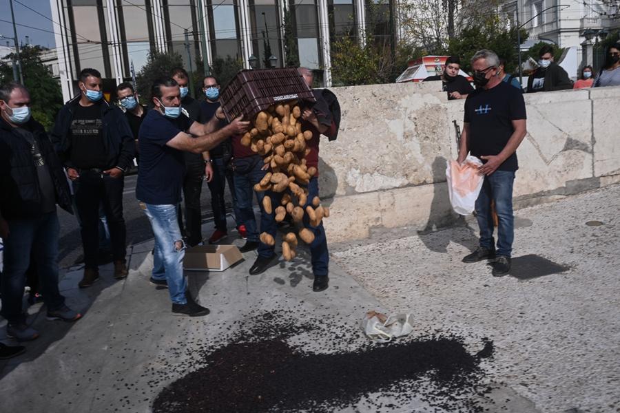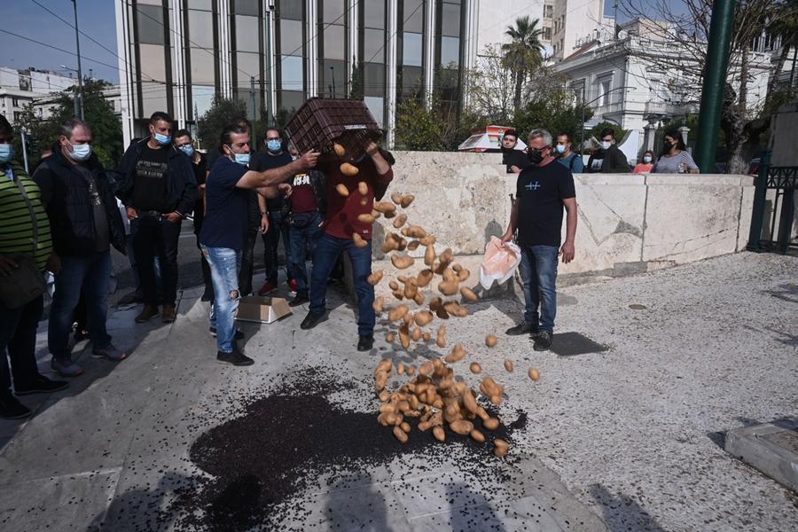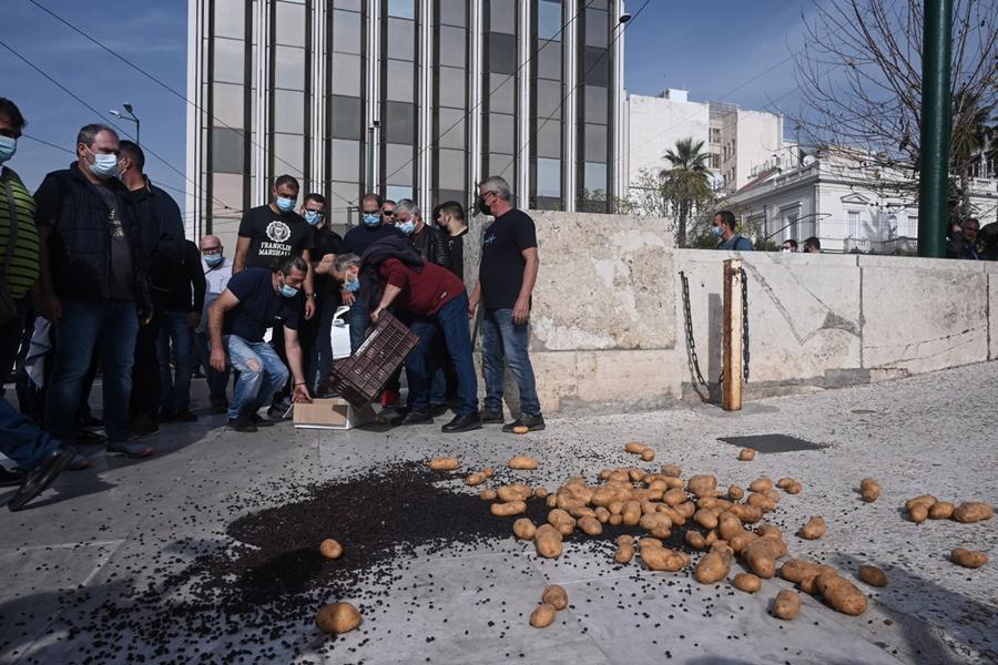 Ταυτόχρονα αντιπροσωπεία παραδίδει το ψήφισμα του συλλαλητηρίου στη Βουλή και στα κόμματα, ενώ σε μία συμβολική κίνηση πυρόπληκτοι παραγωγοί από την Πελοπόννησο άδειασαν στο πλάι της εισόδου του κοινοβουλίου πατάτες και σταφίδες.