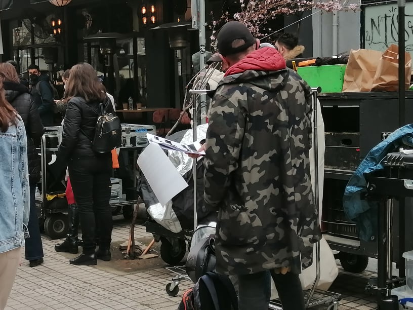 Από νωρίς το πρωί 200 τουλάχιστον κομπάρσοι βρίσκονται στο σημείο για τα γυρίσματα της σκηνής που αναμένεται να διαρκέσουν όλη την ημέρα.