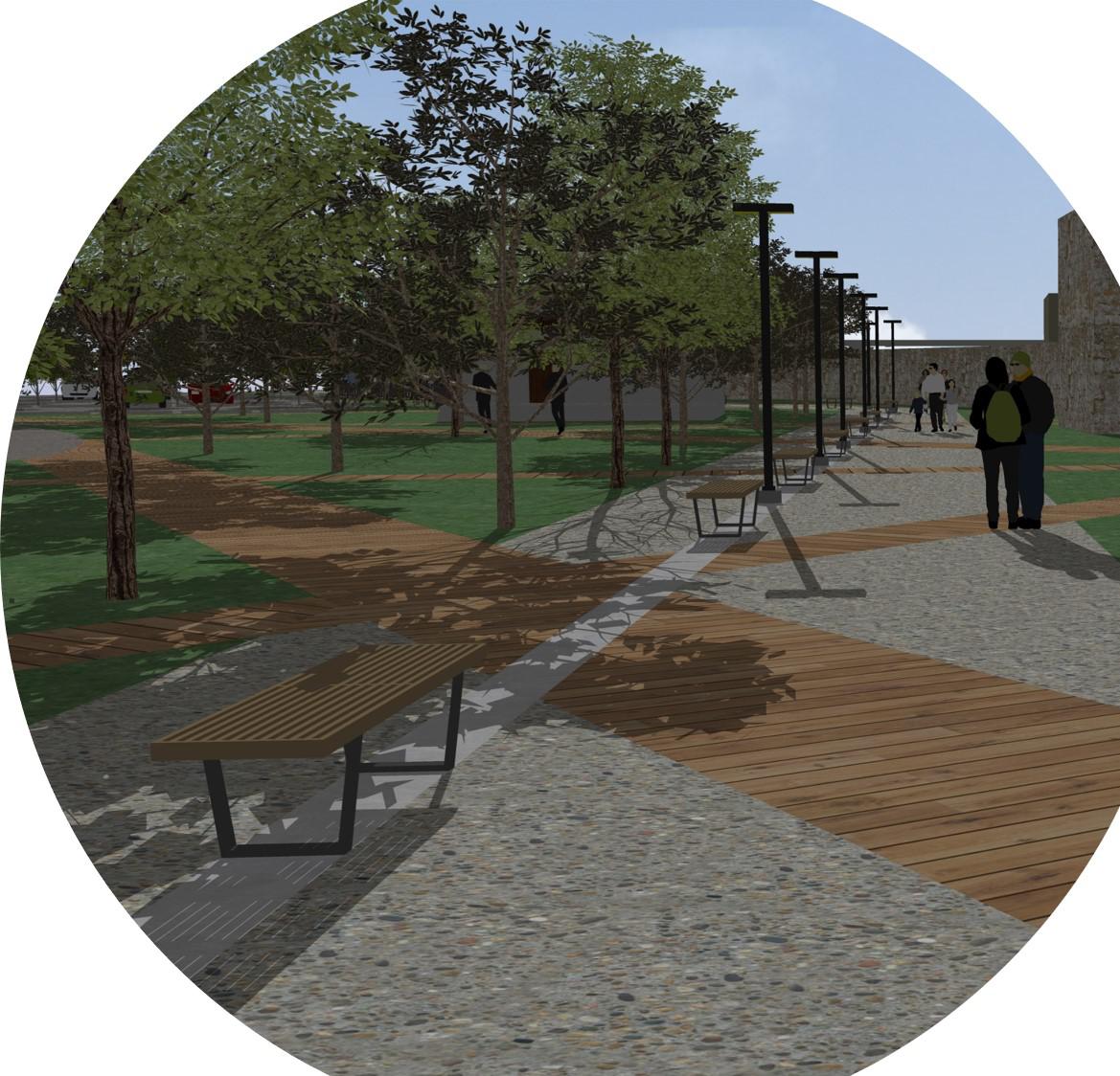 Ακόμη, προτείνεται ο εμπλουτισμός της φύτευσης με ενδημικά είδη δέντρων και μικρών θάμνων προκειμένου να τονιστούν οπτικές φυγές, να σκιαστούν τοπικά περιοχές στάσης και κίνησης, να βελτιωθεί το μικροκλίμα και να αναβαθμιστεί αισθητικά το υπό διαμόρφωση τμήμα.