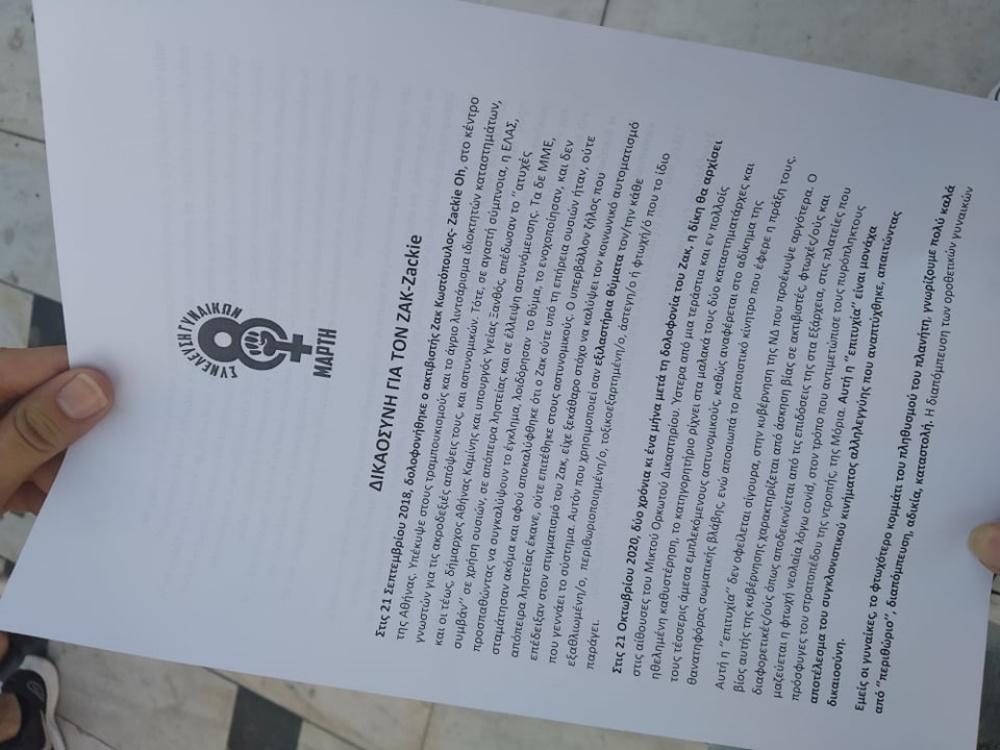 Πορεία διαμαρτυρίας πραγματοποιείται αυτή την ώρα για την επέτειο των δύο χρόνων από τη δολοφονία του Ζακ Κωστόπουλου, με αφετηρία το άγαλμα του Βενιζέλου. Η πορεία κατευθύνεται αυτήν την ώρα από την Εγνατία προς την Καμάρα. Με κεντρικό σύνθημα “Η zackie ζει τσακίστε τους ναζί” εκατοντάδες διαδηλωτές ζητούν δικαιοσύνη καθώς στις 21 Οκτωβρίου αναμένεται να ξεκινήσει η δίκη στην αίθουσα του Μεικτού Ορκωτού Δικαστηρίου. Η παρουσία των αστυνομικών είναι διακριτική, η τροχαία ρυθμίζει την κυκλοφορία στο κέντρο της Θεσσαλονίκης.