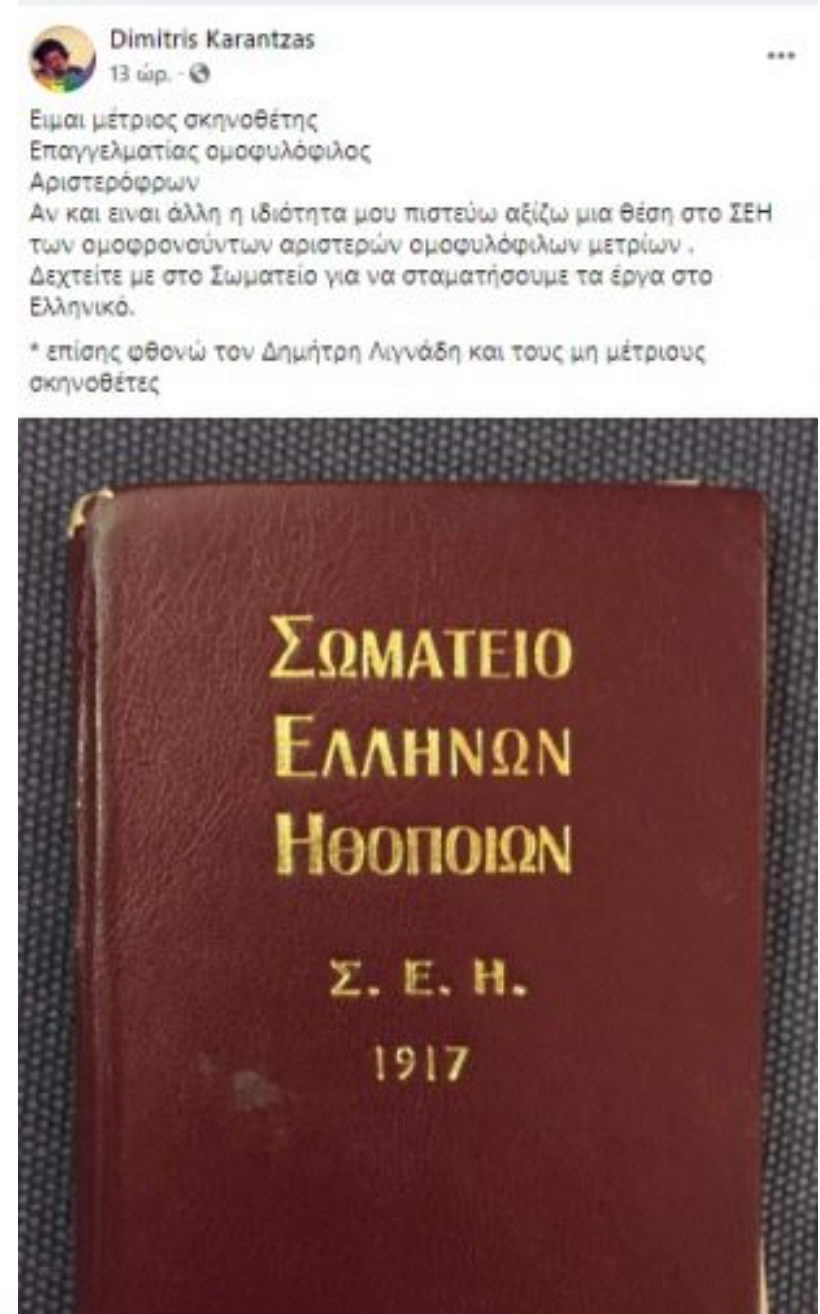 «Εκτός από επαγγελματίες ομοφυλόφιλοι, είμαστε όλοι και μέτριοι ηθοποιοί», αναφέρουν μεταξύ άλλων, αρκετοί ηθοποιοί, σε ένδειξη στήριξης στον πρόεδρο του ΣΕΗ, Σπύρο Μπιμπίλα, μετά τους απαξιωτικούς χαρακτηρισμούς και την επίθεση Λιγνάδη.