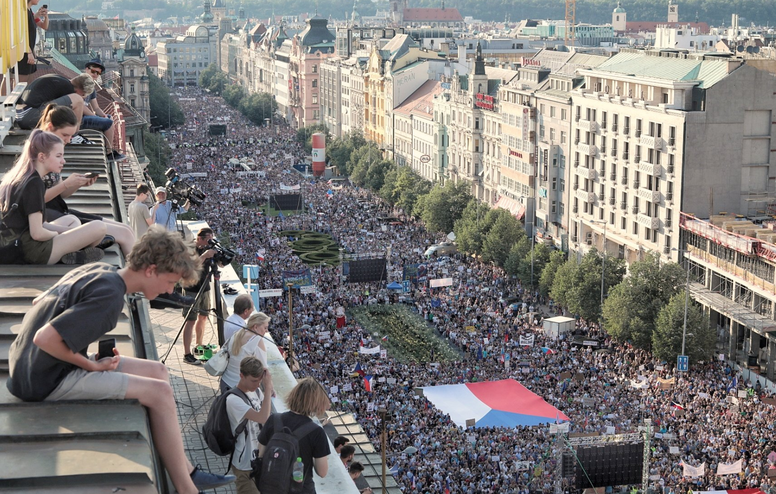 Οι διαδηλωτές για ακόμη μια φορά γέμισαν τη μεγάλη Πλατεία Βέντσεσλας, τη μεγαλύτερη οδική αρτηρία της πρωτεύουσας και εμβληματικό τόπο της ιστορίας της Τσεχίας.
