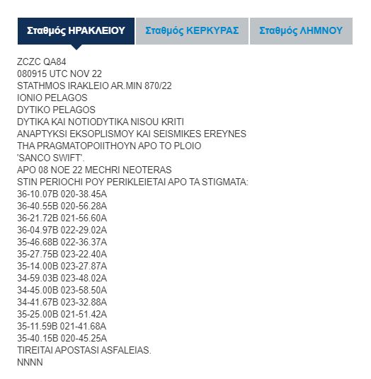 NAVTEX που εξέδωσε ο Σταθμός Ηρακλείου προβλέπει ότι από σήμερα 8 Νοεμβρίου 2022 και μέχρι νεωτέρας, δεσμεύονται περιοχές στο Ιόνιο Πέλαγος, το Δυτικό Πέλαγος και δυτικά και ανατολικά της Κρήτης, προκειμένου το πλοίο Nanco Swift να πραγματοποιήσει ανάπτυξη εξοπλισμού και σεισμικές έρευνες.
