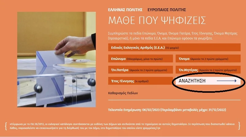 Κάνοντας κλικ πάνω στο κουμπί «ΑΝΑΖΗΤΗΣΗ», θα βρείτε τον εκλογικό σας αριθμό, αλλά και τον τόπο στον οποίο ψηφίζετε.
