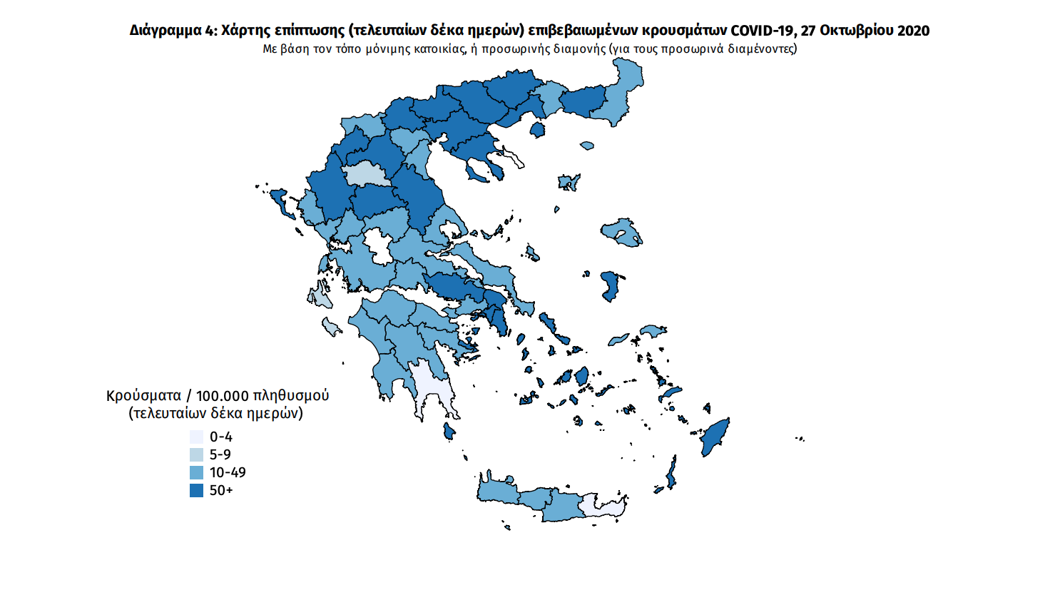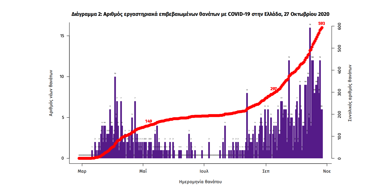 Τα στοιχεία που παρουσιάζονται αφορούν περιστατικά από την επιδημιολογική επιτήρηση της νόσου από το νέο κορωνοϊό (COVID19), με βάση τα δεδομένα που έχουν δηλωθεί στον ΕΟΔΥ και καταγραφεί μέχρι τις 27 Οκτωβρίου 2020 (ώρα 15:00). Τα νέα εργαστηριακά επιβεβαιωμένα κρούσματα της νόσου είναι 1259, εκ των οποίων 112 συνδέονται με γνωστές συρροές και 62 εντοπίστηκαν κατόπιν ελέγχων στις πύλες εισόδου της χώρας. Ο συνολικός αριθμός των κρουσμάτων ανέρχεται σε 32752 (ημερήσια μεταβολή +4.0%), εκ των οποίων 55.5% άνδρες. 1 Οι νέοι θάνατοι ασθενών με COVID-19 είναι 12, ενώ από την έναρξη της επιδημίας έχουν καταγραφεί συνολικά 593 θάνατοι.Η διάμεση ηλικία των ασθενών που απεβίωσαν είναι 79 έτη. Ο αριθμός των ασθενών που νοσηλεύονται διασωληνωμένοι είναι 102 (67.6% άνδρες). Η ημερήσια κατανομή των επιβεβαιωμένων κρουσμάτων είναι η ακόλουθη (η γραμμή παριστάνει την συνολική, αθροιστική κατανομή των κρουσμάτων).