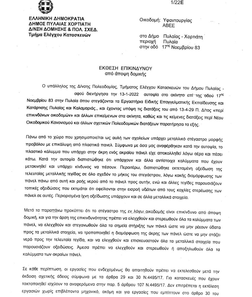 Ακόμα πιο εντυπωσιακό είναι ότι το τμήμα Ελέγχου Κατασκευών της Διεύθυνσης Δόμησης του δήμου Πυλαίας Χορτιάτη, μετά από αυτοψία στο χώρο, διαπίστωσε ότι το στέγαστρο στο σιδερόφραχτο μπαλκόνι, που χρησιμοποιείται ως αυλή για δεκάδες παιδιά με ειδικές ανάγκες, είναι επικίνδυνο. Ο υπάλληλος, που διενέργησε τον έλεγχο, διαπιστώνει ότι οι πλάκες του στεγάστρου έχουν αποκολληθεί και υπάρχουν φθορές και σκουριές στο σκελετό της κατασκευής. Την εν λόγω αυτοψία την έχει κοινοποιήσει στον ιδιοκτήτη, στο δήμο, στη διεύθυνση του σχολείου, αλλά και για κάθε ενδεχόμενο στο Αστυνομικό Τμήμα της περιοχής.