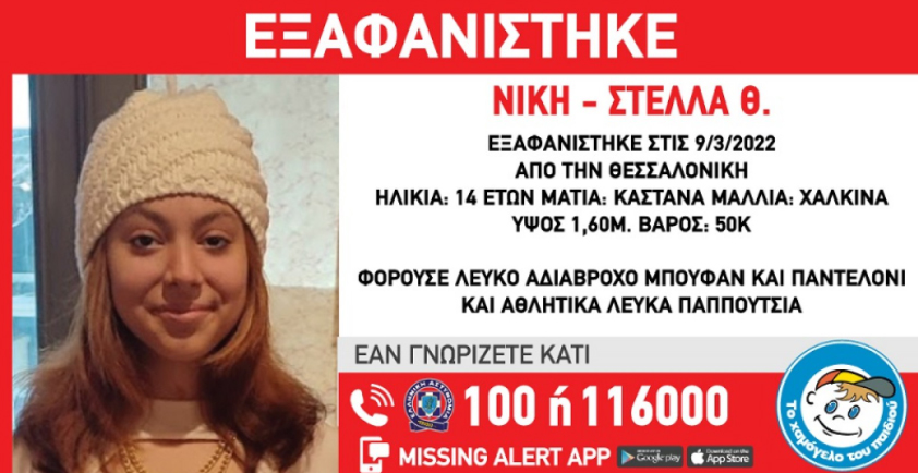 Την κινητοποίηση των αστυνομικών αρχών έχει προκαλέσει η εξαφάνιση 14χρονης από τη Θεσσαλονίκη, όπου στις 9 Μαρτίου, εξαφανίστηκε από την περιοχή της Θεσσαλονίκης. Πρόκειται για την Νίκη – Στέλλα Θ. 14 ετών, ελληνικής καταγωγής, με ύψος 1.60 μ., 58 κιλά, έχει χαλκινά μαλλιά και καστανά μάτια.