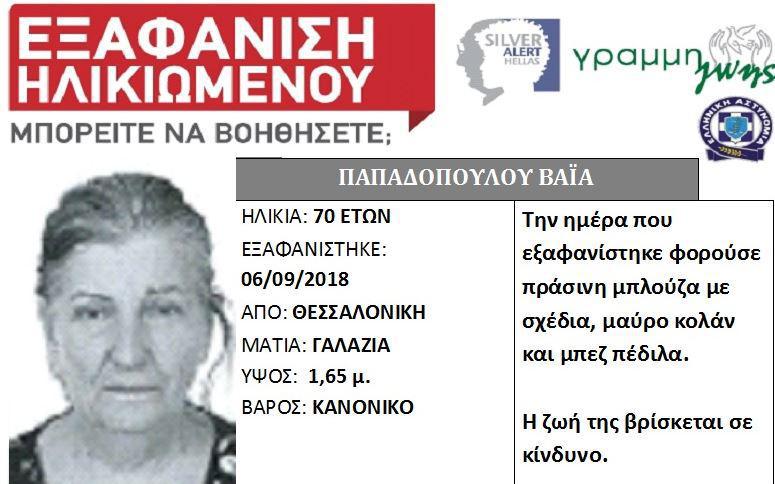 Πρόκειται για την Βαία Παπαδοπούλου, ετών 70, της οποίας τα ίχνη χάθηκαν εδώ και μέρες. Όταν εξαφανίστηκε, φορούσε πράσινη μπλούζα με σχέδια, μαύρο κολάν και μπεζ πέδιλα. Η ζωή της βρίσκεται σε κίνδυνο, όπως σημειώνεται.