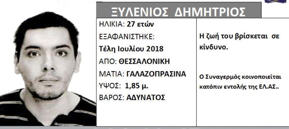 Πρόκειται για τον Δημήτρη Ξυλένιο, τα ίχνη του οποίου αγνοούνται από τα τέλη Ιουλίου. Σύμφωνα με την περιγραφή που δόθηκε στη δημοσιότητα από τη Γραμμή Ζωής, το ύψος του είναι 1, 85 μ, είναι αδύνατος στην όψη και έχει γαλαζοπράσινα μάτια.