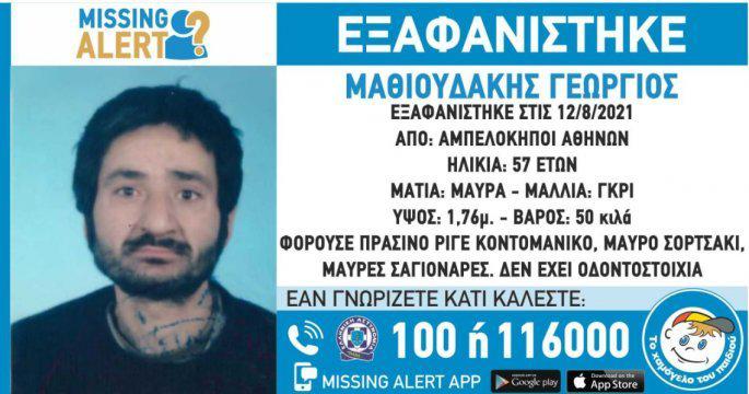 Το «Χαμόγελο του Παιδιού» σε Missing Alert που εκδόθηκε, αναφέρει ότι: Στις 12/8/2021, εξαφανίστηκε από την περιοχή των Αμπελοκήπων Αθήνας, ο Μαθιουδάκης Γεώργιος, 57 ετών.