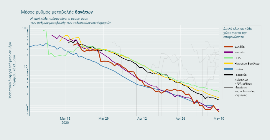 - Μέσος ρυθμός μεταβολής θανάτων: το γράφημα αποτυπώνει πόσο γρήγορα αυξάνονται οι θάνατοι σε επιλεγμένες χώρες από την 1η Μαρτίου και έπειτα