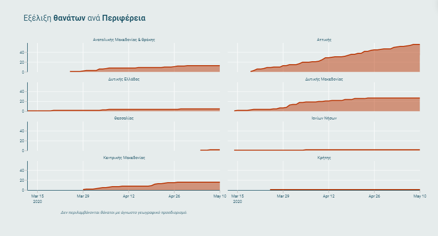 - Εξέλιξη θανάτων ανά περιφέρεια στην Ελλάδα: το γράφημα αποτυπώνει τους αθροιστικούς θανάτους ανά ημέρα, χωρίς να περιλαμβάνονται εκείνοι για τους οποίους δεν είναι γνωστός ο γεωγραφικός προσδιορισμός