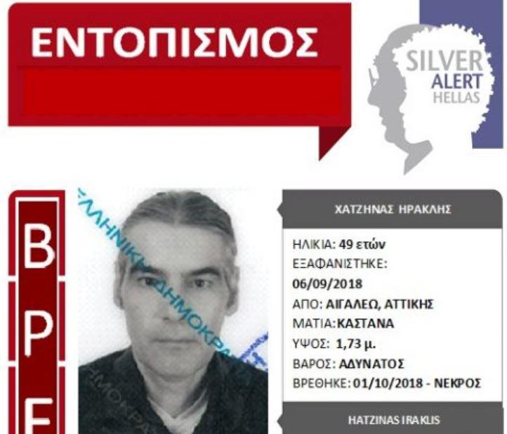 Η σορός που ταυτοποιήθηκε με τη μέθοδο ανάλυσης DNA, ανήκει στον 49χρονο Ηρακλή Χατζήνα, ο οποίος είχε εξαφανισθεί στις αρχές Σεπτεμβρίου και για τον οποίο είχε εκδοθεί Silver Alert.