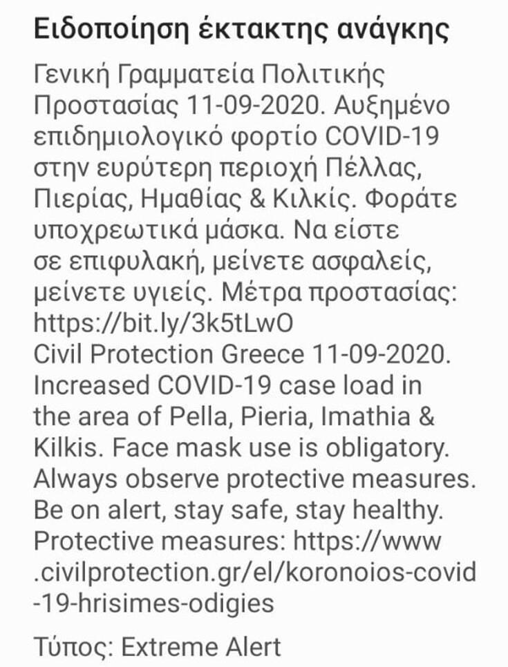 Το μήνυμα του 112 λέει: Γενική Γραμματεία Πολιτικής Προστασίας 11-09-2020. Αυξημένο επιδημιολογικό φορτίο Covid-19 στην ευρύτερη περιοχή Πέλλας, Πιερίας, Ημαθίας και Κιλκίς. Φοράτε υποχρεωτικά μάσκα. Να είστε σε επιφυλακή, μείνετε ασφαλείς, μείνετε υγιείς.