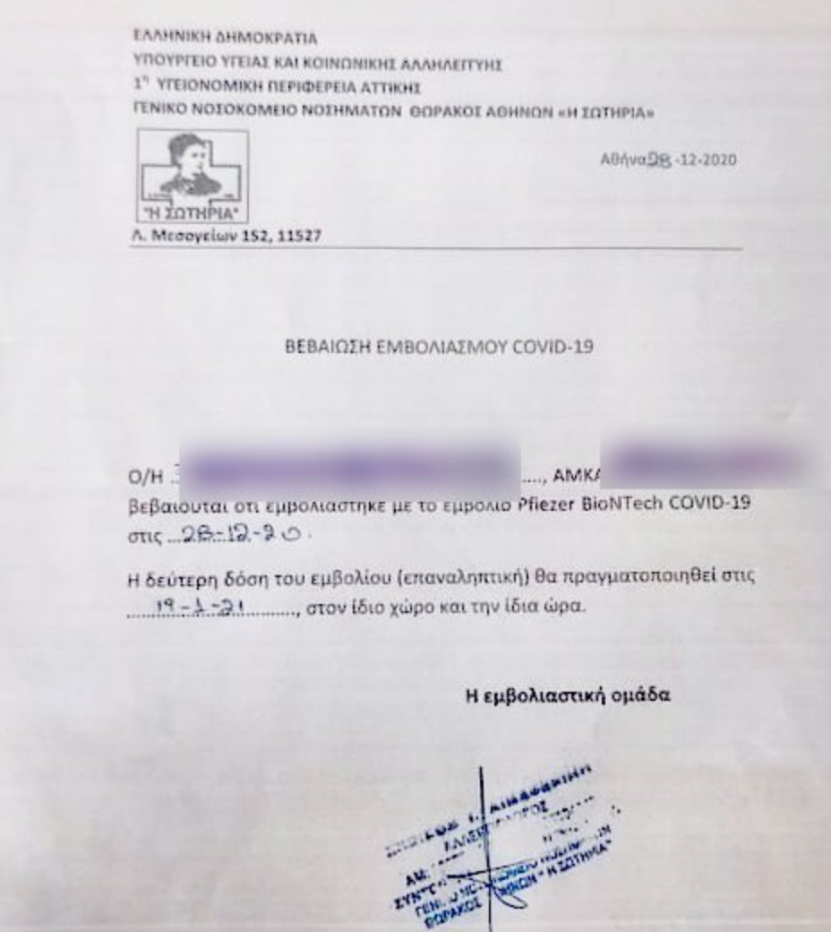 Στο έγγραφο υπάρχει το όνομα του πολίτη που έκανε το εμβόλιο, το ΑΜΚΑ του, το όνομα της εταιρείας του εμβολίου που έκανε, η ημερομηνία εμβολιασμού του αλλά και η ημερομηνίας της δεύτερης δόσης του εμβολίου.