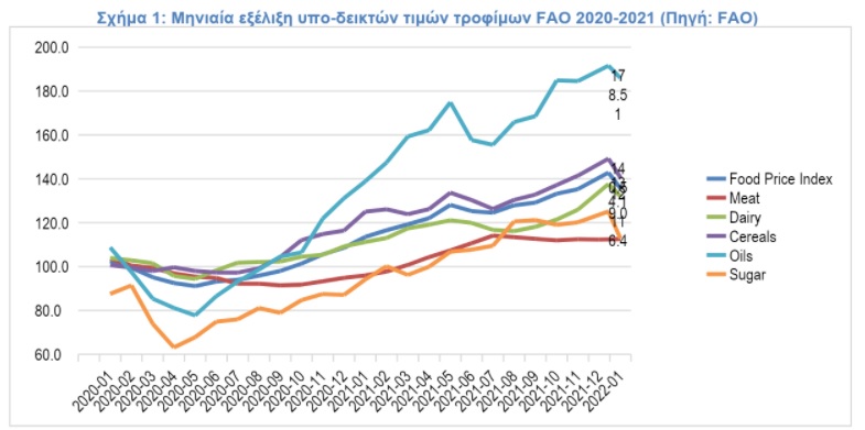 Σε σχέση με τις διεθνείς τιμές πρώτων υλών, εξακολουθούν να καταγράφονται αρνητικές εξελίξεις από τον Παγκόσμιο Οργανισμό Τροφίμων και Γεωργίας των Ηνωμένων Εθνών (FAO). Ο δείκτης έφτασε τον Ιανουάριο του 2022 στις 135,7 μονάδες 32% μονάδες αυξημένος σε σχέση με τον Ιανουάριο του 2020 και κατά 19% σε σχέση με τον Ιανουάριο 2021. Όλοι οι επιμέρους δείκτες παρουσιάζουν αυξήσεις (δημητριακά, έλαια, κρέας, γαλακτοκομικά, ζάχαρη). Συγκεκριμένα, σε σχέση με την προηγούμενη χρονιά, τον Ιανουάριο 2021 οι τιμές του Κρεάτος είναι αυξημένες κατά 17%, των γαλακτοκομικών κατά 19%, των δημητριακών κατά 12%, των ελαίων κατά 34% και της ζάχαρης κατά 20%. Οι αυξήσεις οφείλονται κυρίως στην αποδοτικότητα της παραγωγής στις μεγάλες παραγωγούς χώρες και στην αύξηση της ζήτησης από τις χώρες της Ασίας. Αρκετές από αυτές τις μεταβολές επηρεάζουν την παραγωγή τροφίμων στην Ελλάδα λόγω των εισαγόμενων πρώτων υλών, αλλά και τις εισαγωγές τελικών τροφίμων και ποτών από τις διεθνείς αγορές.