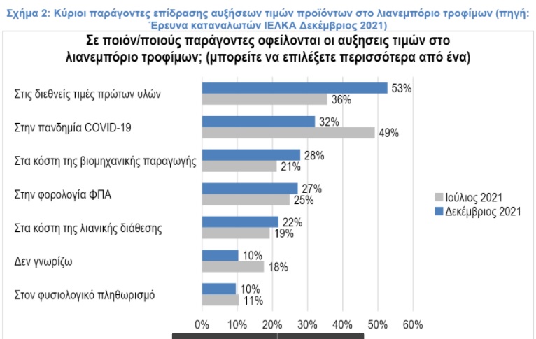 Όπως καταγράφεται στο σχήμα 2, αυτή είναι και η εικόνα που έχει η πλειοψηφία των καταναλωτών. Όπως αποτυπώνεται στην έρευνα καταναλωτών του ΙΕΛΚΑ που πραγματοποιήθηκε τον Δεκέμβριο 2021, η πλειοψηφία των καταναλωτών σε ποσοστό 53% αποδίδει τις ανατιμήσεις στις διεθνείς τιμές των πρώτων υλών, ακολουθεί η πανδημία COVID-19 με ποσοστό 32%, τα κόστη της βιομηχανικής παραγωγής με 28%, η φορολογία ΦΠΑ με 27% και τα κόστη λιανικής διάθεσης με 22%. Ιδιαίτερα έντονη είναι η μετακίνηση της γνώμης του κοινού από τον Ιούλιο του 2021 ως τον Δεκέμβριο του 2022 για την απόδοση των ανατιμήσεων από την πανδημία στις διεθνείς εξελίξεις. Τον Ιούλιο του 2021, όταν και οι ανατιμήσεις έκαναν την εμφάνιση τους, οι καταναλωτές τις απέδιδαν στην πανδημία σε ποσοστό 49%, ποσοστό που έπεσε στο 32%, ενώ αντίθετα το 36% απέδιδε τις ανατιμήσεις στις διεθνείς τιμές των πρώτων υλών, ποσοστό που αυξήθηκε στο 53%.