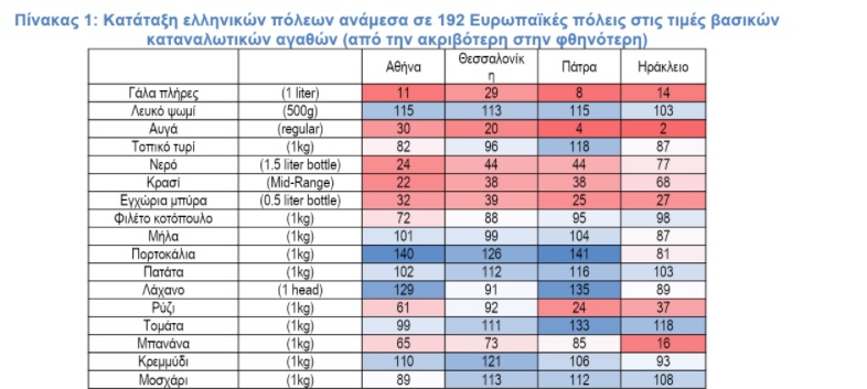 Σε σχέση με τα περισσότερα είδη που καταγράφονται για τον προσδιορισμό του συγκεκριμένου δείκτη (πίνακας 1), οι ελληνικές πόλεις διατηρούν ανταγωνιστική θέση, κυρίως στα οπωροκηπευτικά, το ψωμί και το κρέας. Συγκριτικά υψηλές θέσεις καταγράφονται κυρίως στα γαλακτοκομικά, στο εμφιαλωμένο νερό και στα αλκοολούχα ποτά.