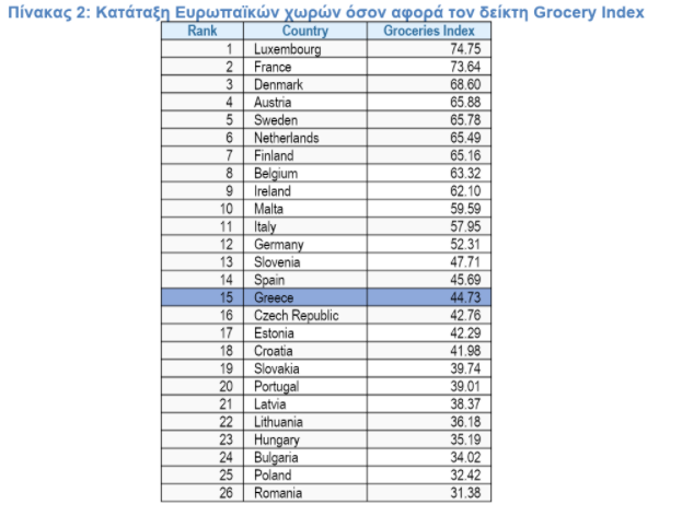 Παράλληλα όπως καταγράφεται στον πίνακα 2, συνολικά η Ελλάδα στον συγκεκριμένο δείκτη βρίσκεται στην 15η θέση ανάμεσα στις 26 χώρες, χαμηλότερα από τον μέσο όρο της Ευρωπαϊκής Ένωσης. Οι τρεις ακριβότερες χώρες είναι το Λουξεμβούργο, η Γαλλία και η Δανία. Οι τρεις φθηνότερες χώρες είναι η Ρουμανία, η Πολωνία και η Βουλγαρία.
