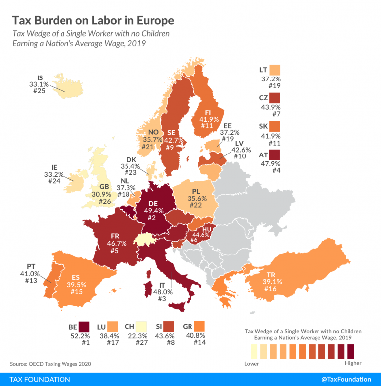 Οι μεμονωμένοι εργαζόμενοι μέσου εισοδήματος που ζουν σε χώρες του ΟΟΣΑ κατέβαλαν το 2019 πάνω από 1/3 ή 36% του μισθού τους σε φόρους εισοδήματος και ασφαλιστικές εισφορές. Η φορολογική επιβάρυνση της εργασίας για τους εργαζόμενους χωρίς παιδιά στον ΟΟΣΑ κυμαίνεται από μόλις 7% στη Χιλή έως 52,2% στο Βέλγιο. Από τις 36 χώρες του ΟΟΣΑ σε 14 η φορολογική επιβάρυνση της εργασίας ξεπερνά το 40%, σε 14 χώρες κυμαίνεται μεταξύ 40-30% και σε 8 χώρες είναι κάτω από 30%. Οι χώρες με την υψηλότερη φορολογική επιβάρυνση στην εργασία είναι το Βέλγιο (52,2%), η Γερμανία (49,4%), η Ιταλία (48,0%), η Αυστρία (47,9%) και η Γαλλία (46,7%). Οι χώρες με τη χαμηλότερη φορολογική επιβάρυνση στην εργασία είναι η Χιλή (7%), η Νέα Ζηλανδία (18,8%), το Μεξικό (20,1%), η Ελβετία (22,3%) και το Ισραήλ (22,7%).
