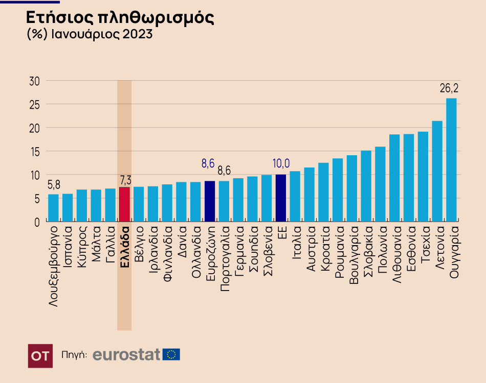 Αναφορικά με την Ελλάδα,σύμφωνα με τα τελευταία στοιχεία της ΕΛΣΤΑΤ, ο ετήσιος πληθωρισμός επιβράδυνε στο 7% τον Ιανουάριο, από 7,2% τον Δεκέμβριο του 2022, 8,5% τον Νοέμβριο και 9,1% τον Οκτώβριο. Ο δείκτης παρέμεινε σε πτωτική τροχιά για τέταρτο μήνα, μετά το 12% του Σεπτεμβρίου.