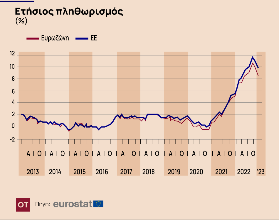 Ο ετήσιος πληθωρισμός της Ευρωπαϊκής Ένωσης διαμορφώθηκε στο 10% τον Ιανουάριο του 2023, από 10,4% τον Δεκέμβριο και 5,6% από τον Ιανουάριο του 2023.