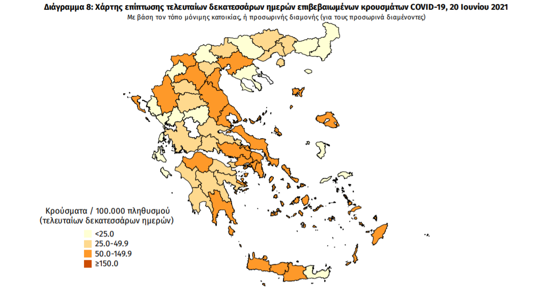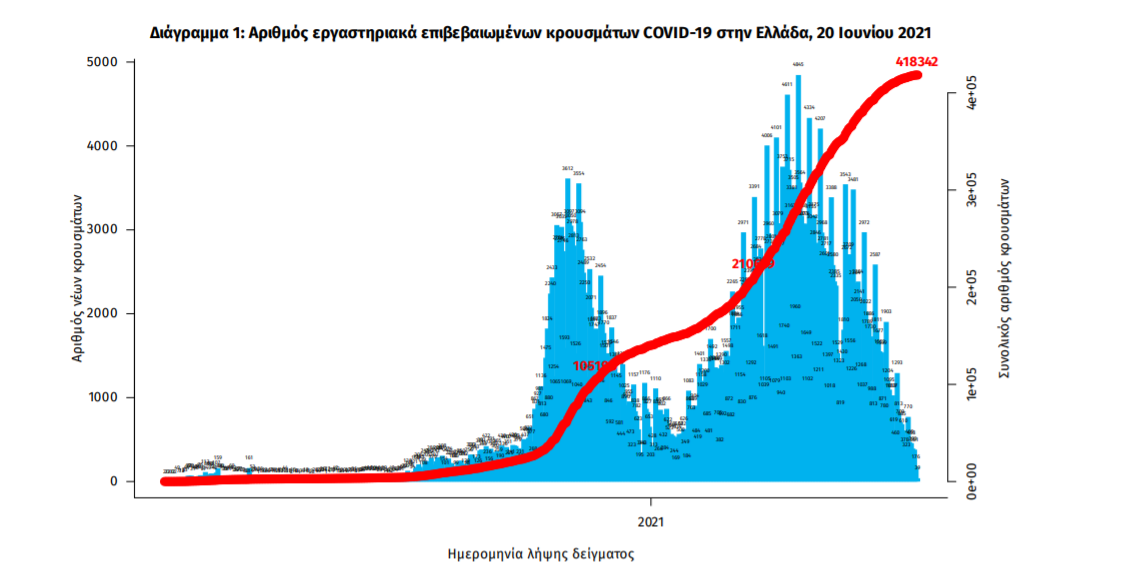 Τα νέα εργαστηριακά επιβεβαιωμένα κρούσματα της νόσου που καταγράφηκαν τις τελευταίες 24 ώρες είναι 248, εκ των οποίων 7 εντοπίστηκαν κατόπιν ελέγχων στις πύλες εισόδου της χώρας. Ο συνολικός αριθμός των κρουσμάτων ανέρχεται σε 418.342 (ημερήσια μεταβολή +0.1%), εκ των οποίων 51.2% άνδρες. 1 Με βάση τα επιβεβαιωμένα κρούσματα των τελευταίων 7 ημερών, 31 θεωρούνται σχετιζόμενα με ταξίδι από το εξωτερικό και 900 είναι σχετιζόμενα με ήδη γνωστό κρούσμα.