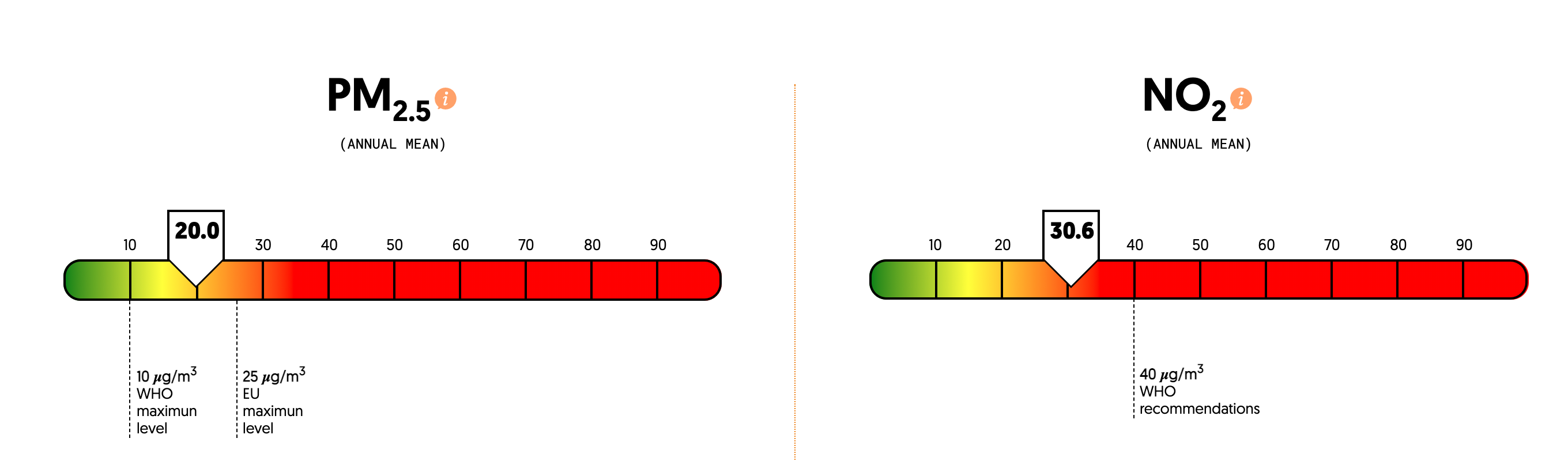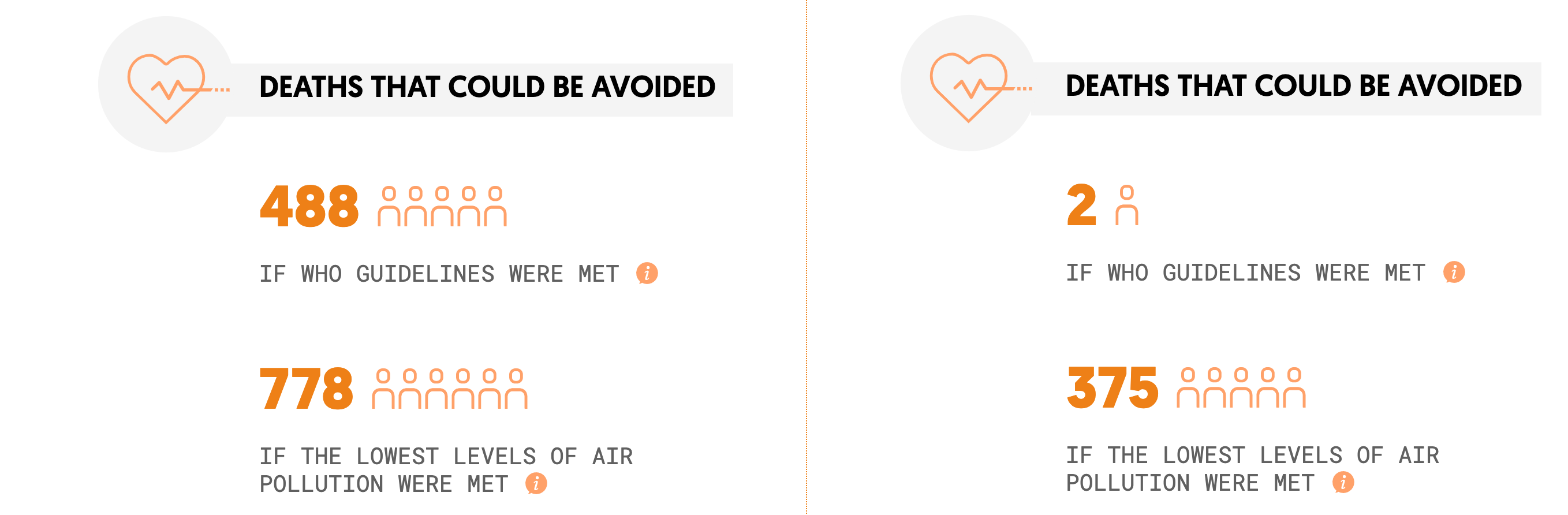Σχεδόν το 88% του πληθυσμού της Αθήνας (της μητροπολιτικής περιοχής) και της Θεσσαλονίκης εκτιμάται ότι δεν πληροί τον ελάχιστο στόχο του Παγκόσμιου Οργανισμού Υγείας για την πρόσβαση των κατοίκων σε κοντινό πράσινο, ούτως ώστε να αποφεύγονταν 1.431 θάνατοι το χρόνο στην πρωτεύουσα και 245 στη συμπρωτεύουσα. Από την άλλη, σε συγκριτικά καλύτερη θέση από τις ελληνικές πόλεις εκτιμάται ότι βρίσκονται η Λάρισα, τα Ιωάννινα, τα Χανιά, η Πάτρα, τα Τρίκαλα και η Καλαμάτα.