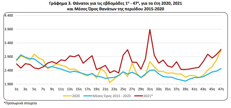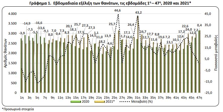 Ακόμη, κατά την περίοδο των πρώτων 47 εβδομάδων του έτους 2021 σε σχέση με την αντίστοιχη περίοδο του έτους 2020, περισσότεροι θάνατοι καταγράφηκαν την 26η (28/6 – 4/7/2021), την 31η (2/8 – 8/8/2021) και την 18η (3/5 – 9/5/2021) με ποσοστά αύξησης 44,6%, 43,2% και 27,3% αντίστοιχα. Οι λιγότεροι θάνατοι σε σχέση με την αντίστοιχη περίοδο του 2020 καταγράφηκαν την 5η (1/2 – 7/2/2021), την 2η (11/1 – 17/1/2021) και την 6η εβδομάδα (8/2 – 14/2/2021) με ποσοστά μείωσης 16,6%, 14,9% και 13,6% αντίστοιχα.