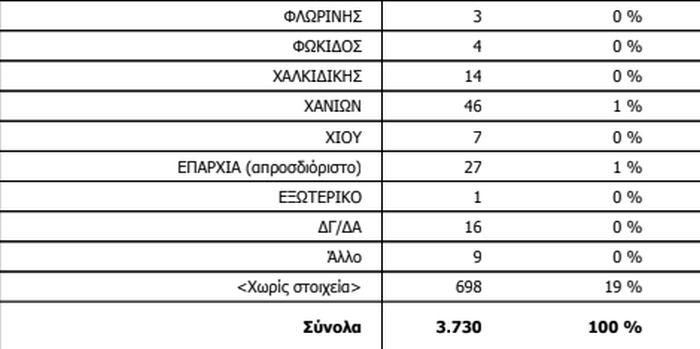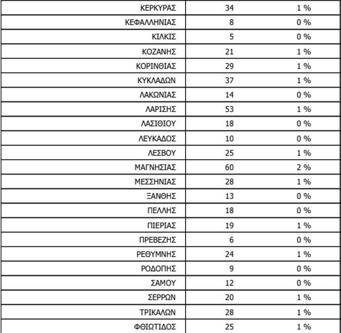 Ακολουθεί η Θεσσαλονίκη με 342 και ποσοστό 9%, το Ηράκλειο της Κρήτης με 98 και 3%, η Αχαΐα με 95 και 3% και η Μαγνησία με 60 και 2%.