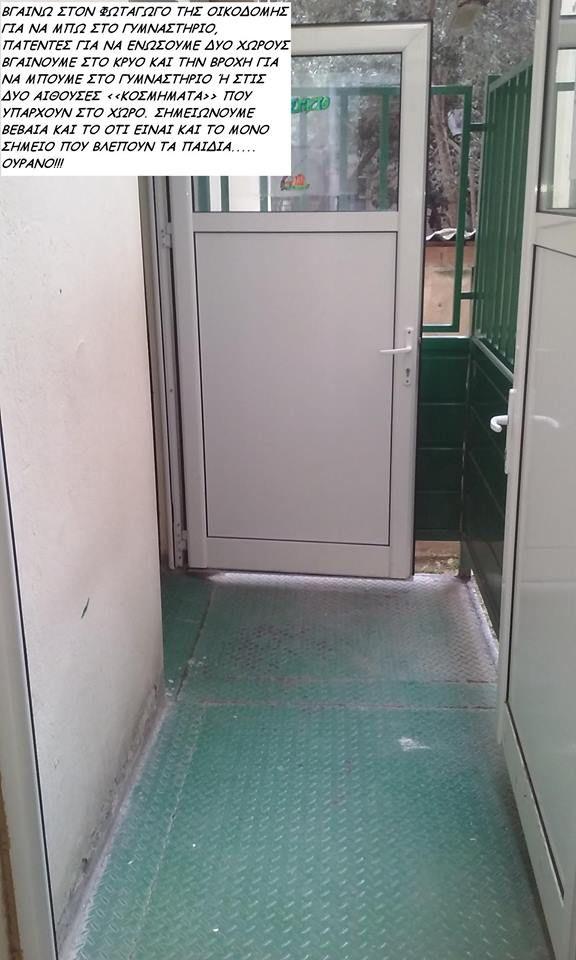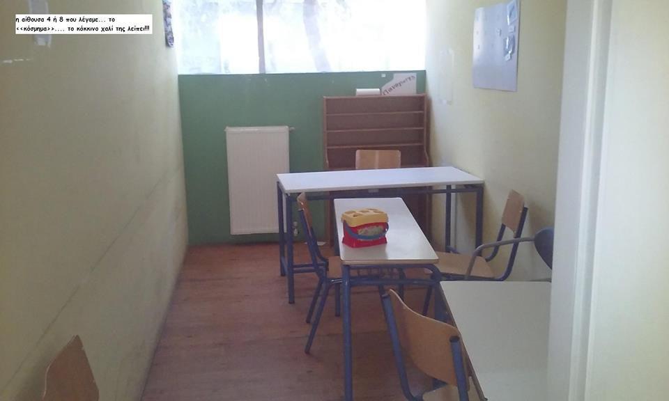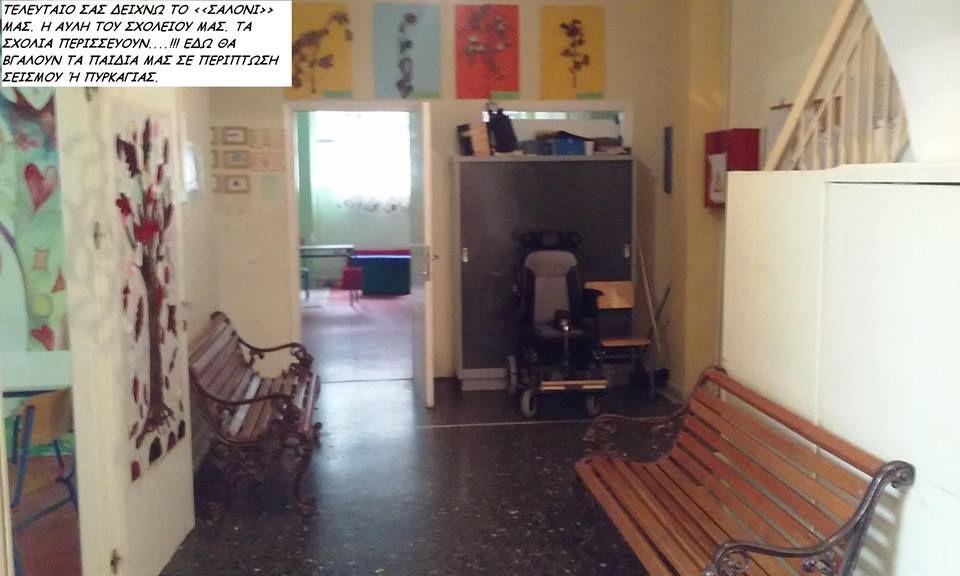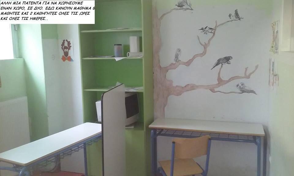 “Στο σχολείο μας δεν υπάρχει αύλειος χώρος!!!! Τα παιδιά “προαυλίζονται” στο διάδρομο και στο “γυμναστήριο”. Κάποιες αίθουσες βρίσκονται στον πάνω όροφο. Η πρόσβαση σ’ αυτόν γίνεται με μία στενή στριφογυριστή σκάλα, η οποία είναι επικίνδυνη για τα παιδιά και τους εκπαδευτικούς, ενώ αποκλείονται από την εκπαιδευτική διαδικασία παιδιά που έχουν υψοφοβία, κινητικά προβλήματα, θέματα ισορροπίας. Ο διαχωρισμός των τάξεων έχει γίνει με γυψοσανίδες. Υπάρχει αίθουσα ήδη μικρή που φιλοξενεί 2 τάξεις!!!”