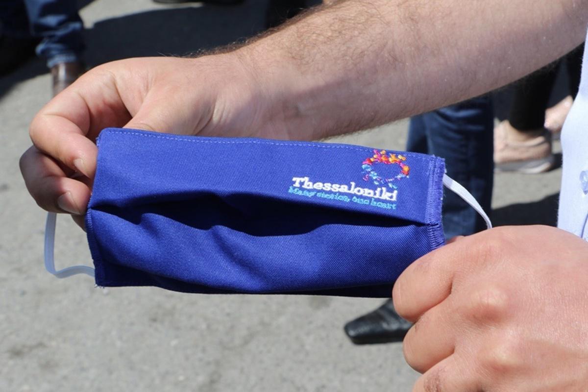 Μάσκες στο χρώμα - σύμβολο της πόλης, με κεντημένο το σήμα της Θεσσαλονίκης με την χαρακτηριστική ψηφιδωτή καρδιά «Many Stories One Heart».