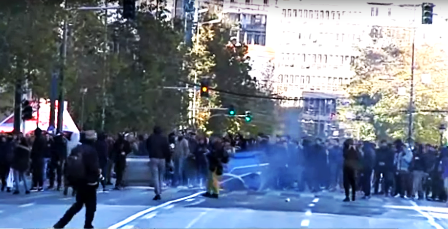 Ορισμένοι από τους κουκουλοφόρους κρατούν καδρόνια και πετούν βόμβες μολότοφ. Στο μεταξύ έχει διακοπή η κυκλοφορία στους γύρω δρόμους.