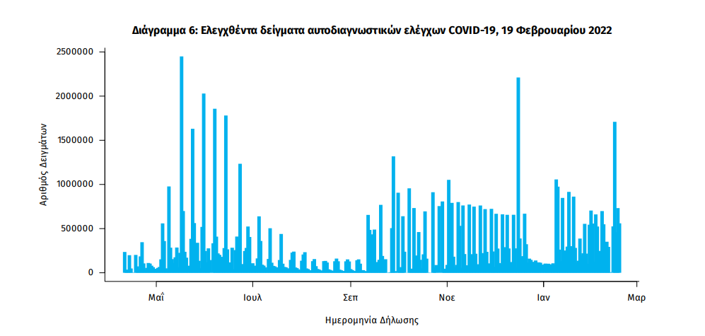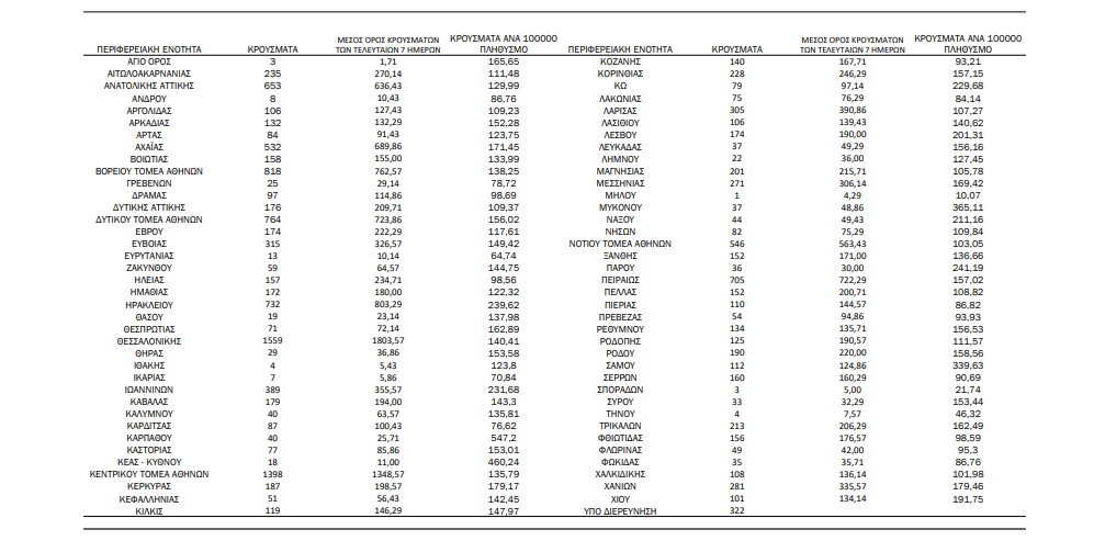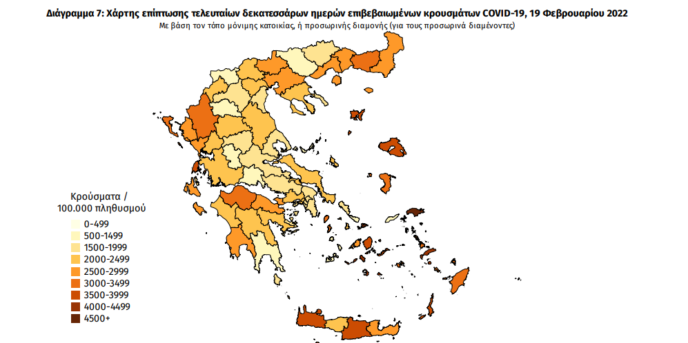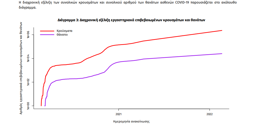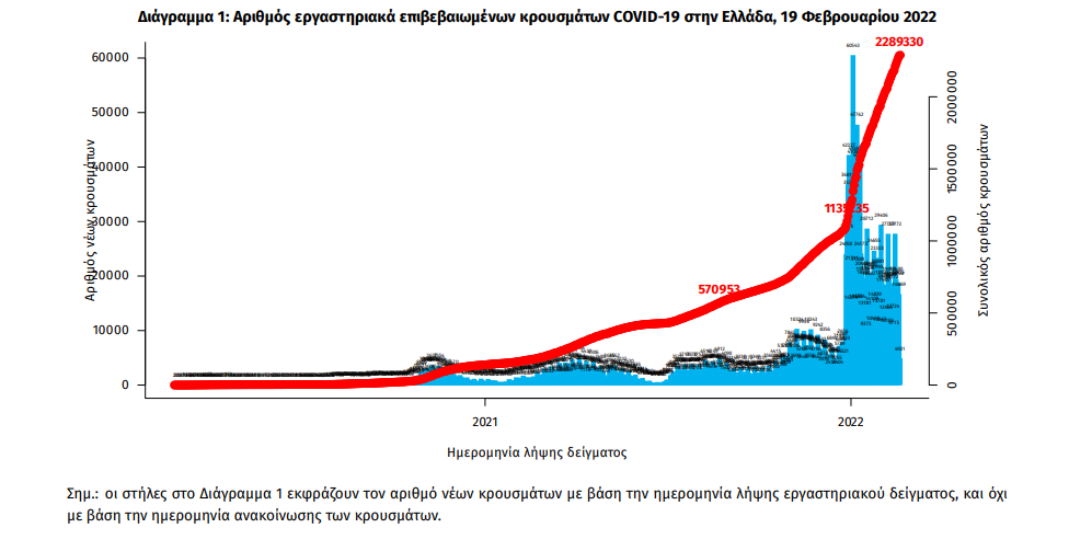 Τα νέα εργαστηριακά επιβεβαιωμένα κρούσματα της νόσου που καταγράφηκαν τις τελευταίες 24 ώρες είναι 15.305 , εκ των οποίων 33 εντοπίστηκαν κατόπιν ελέγχων στις πύλες εισόδου της χώρας. Ο συνολικός αριθμός των κρουσμάτων ανέρχεται σε 2.289.330 (ημερήσια μεταβολή +0.7%), εκ των οποίων 49.6% άνδρες. Με βάση τα επιβεβαιωμένα κρούσματα των τελευταίων 7 ημερών, 313 θεωρούνται σχετιζόμενα με ταξίδι από το εξωτερικό και 2.232 είναι σχετιζόμενα με ήδη γνωστό κρούσμα.