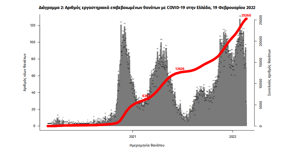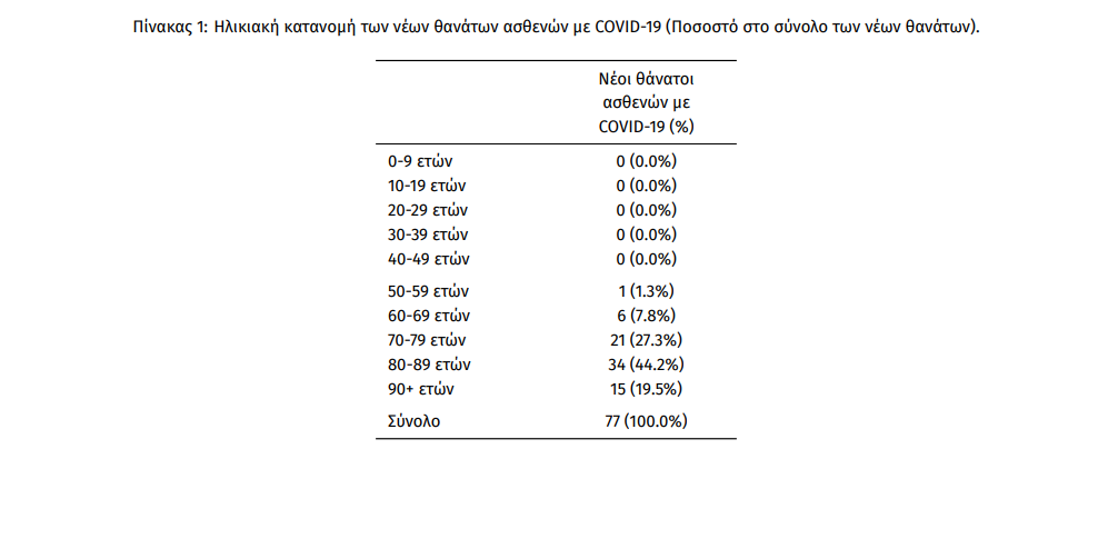 Οι νέοι θάνατοι ασθενών με COVID-19 είναι 77, ενώ από την έναρξη της επιδημίας έχουν καταγραφεί συνολικά 25.260 θάνατοι. Το 95.0% είχε υποκείμενο νόσημα ή/και ηλικία 70 ετών και άνω.