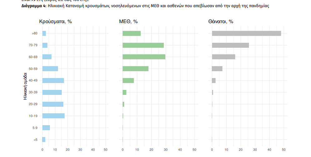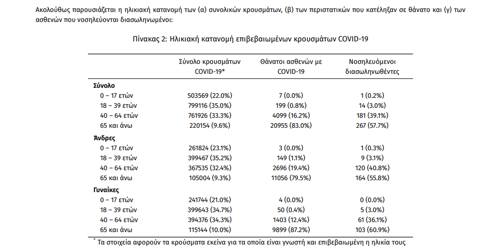 Ο αριθμός των ασθενών που νοσηλεύονται διασωληνωμένοι είναι 463 (63.3% άνδρες). Η διάμεση ηλικία τους είναι 67 έτη. To 86.2% έχει υποκείμενο νόσημα ή/και ηλικία 70 ετών και άνω. Μεταξύ των ασθενών που νοσηλεύονται διασωληνωμένοι, 344 (74.3%) είναι ανεμβολίαστοι ή μερικώς εμβολιασμένοι και 119 (25.7%) είναι πλήρως εμβολιασμένοι. Από την αρχή της πανδημίας έχουν εξέλθει από τις ΜΕΘ 4.202 ασθενείς. Οι εισαγωγές1 νέων ασθενών Covid-19 στα νοσοκομεία της επικράτειας είναι 361 (ημερήσια μεταβολή -2.96%). Ο μέσος όρος εισαγωγών του επταημέρου είναι 374 ασθενείς.Η διάμεση ηλικία των κρουσμάτων είναι 35 έτη (εύρος 0.2 έως 106 έτη), ενώ η διάμεση ηλικία των θανόντων είναι 79 έτη (εύρος 0.2 έως 106 έτη).