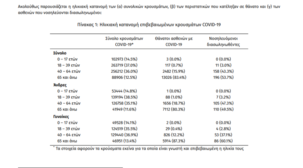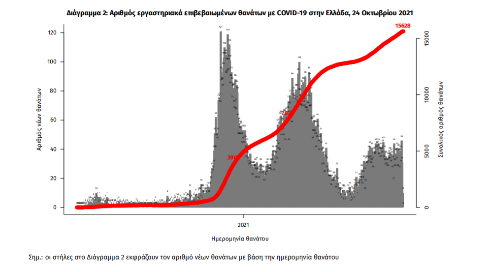 Οι νέοι θάνατοι ασθενών με COVID-19 είναι 30, ενώ από την έναρξη της επιδημίας έχουν καταγραφεί συνολικά 15.628 θάνατοι. Το 95.3% είχε υποκείμενο νόσημα ή/και ηλικία 70 ετών και άνω.