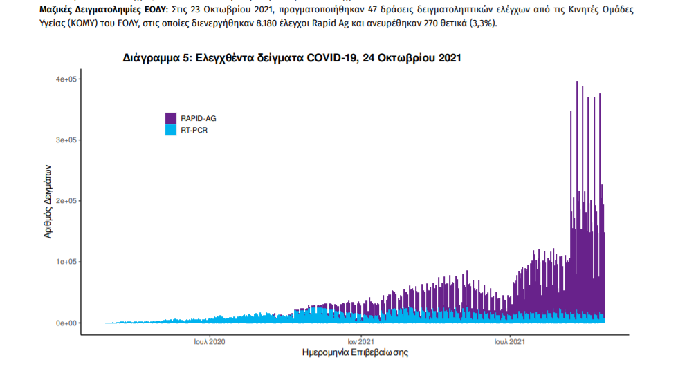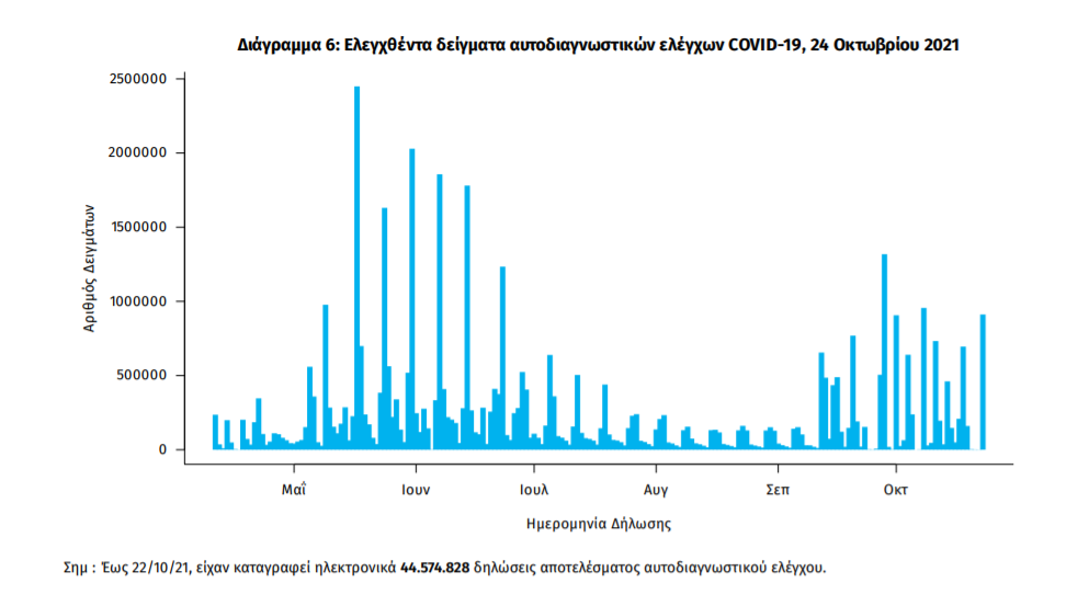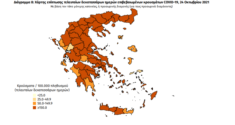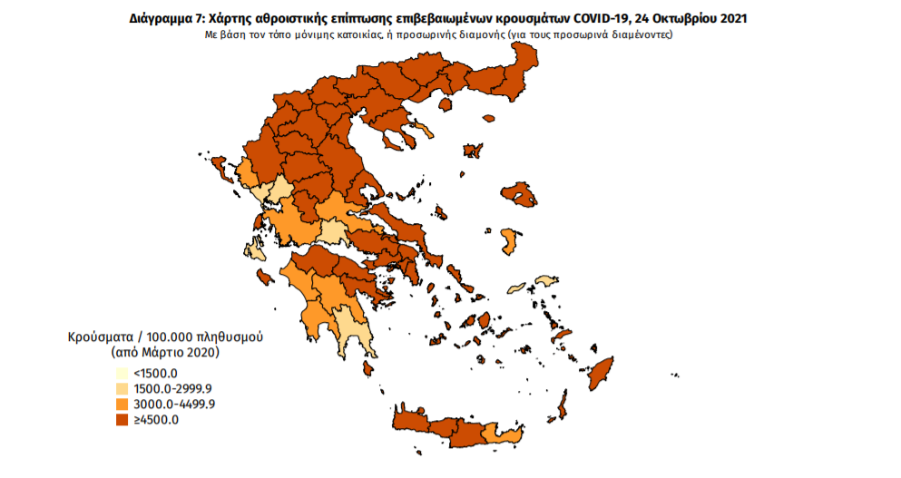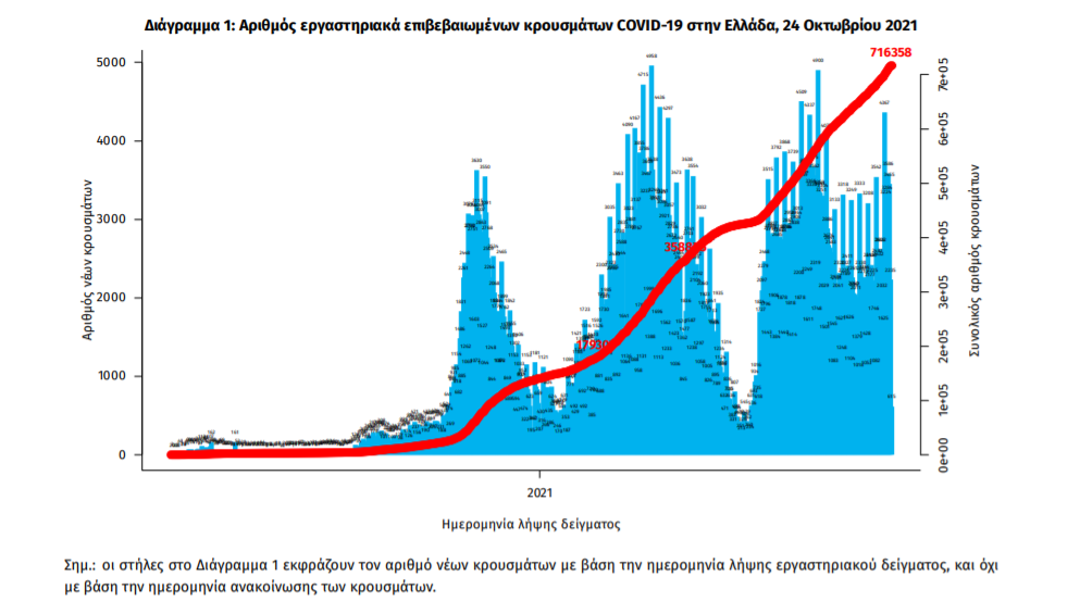 Τα νέα εργαστηριακά επιβεβαιωμένα κρούσματα της νόσου που καταγράφηκαν τις τελευταίες 24 ώρες είναι 2.098 , εκ των οποίων 10 εντοπίστηκαν κατόπιν ελέγχων στις πύλες εισόδου της χώρας. Ο συνολικός αριθμός των κρουσμάτων ανέρχεται σε 716.358 (ημερήσια μεταβολή +0.3%), εκ των οποίων 50.8% άνδρες. Με βάση τα επιβεβαιωμένα κρούσματα των τελευταίων 7 ημερών, 145 θεωρούνται σχετιζόμενα με ταξίδι από το εξωτερικό και 3.164 είναι σχετιζόμενα με ήδη γνωστό κρούσμα.