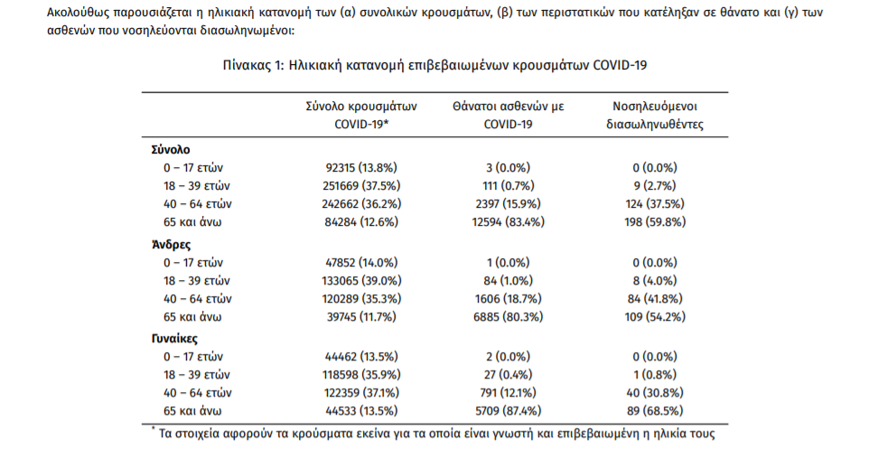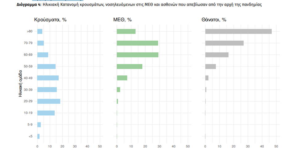 Ο αριθμός των ασθενών που νοσηλεύονται διασωληνωμένοι είναι 331 (60.7% άνδρες). Η διάμεση ηλικία τους είναι 67 έτη. To 81.6% έχει υποκείμενο νόσημα ή/και ηλικία 70 ετών και άνω. Μεταξύ των ασθενών που νοσηλεύονται διασωληνωμένοι, 287 (86.71%) είναι ανεμβολίαστοι ή μερικώς εμβολιασμένοι και 44 (13.29%) είναι πλήρως εμβολιασμένοι. Από την αρχή της πανδημίας έχουν εξέλθει από τις ΜΕΘ 3.209 ασθενείς. Οι εισαγωγές νέων ασθενών Covid-19 στα νοσοκομεία της επικράτειας είναι 178 (ημερήσια μεταβολή -3.78%). Ο μέσος όρος εισαγωγών του επταημέρου είναι 173 ασθενείς.Η διάμεση ηλικία των κρουσμάτων είναι 39 έτη (εύρος 0.2 έως 106 έτη), ενώ η διάμεση ηλικία των θανόντων είναι 78 έτη (εύρος 0.2 έως 106 έτη).