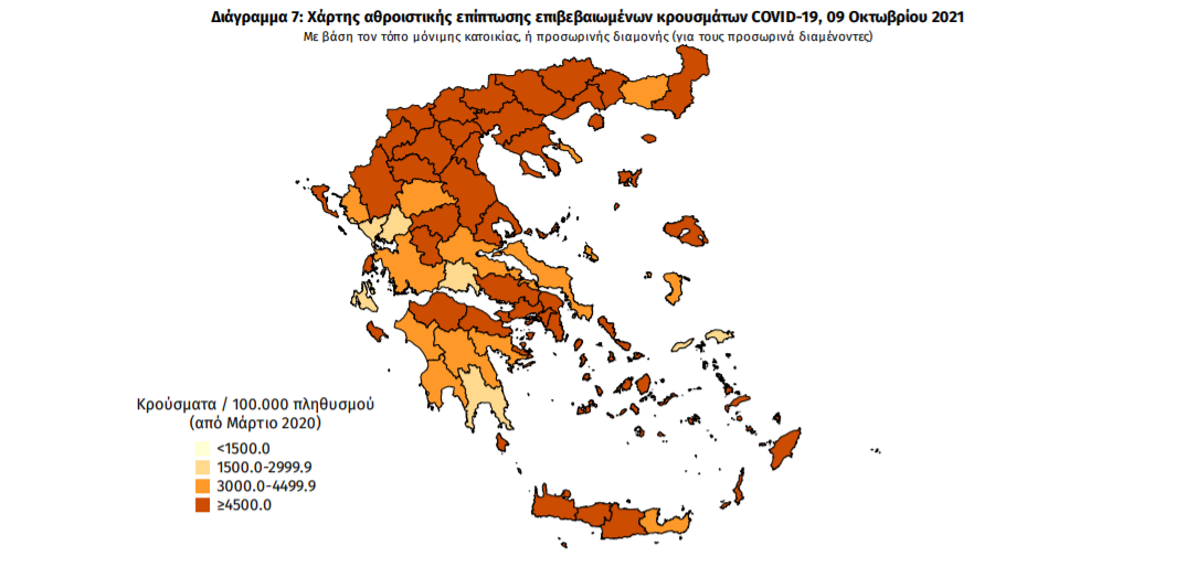 Τα νέα εργαστηριακά επιβεβαιωμένα κρούσματα της νόσου που καταγράφηκαν τις τελευταίες 24 ώρες είναι 2.197 , εκ των οποίων 5 εντοπίστηκαν κατόπιν ελέγχων στις πύλες εισόδου της χώρας. Ο συνολικός αριθμός των κρουσμάτων ανέρχεται σε 675.479 (ημερήσια μεταβολή +0.3%), εκ των οποίων 50.9% άνδρες. Με βάση τα επιβεβαιωμένα κρούσματα των τελευταίων 7 ημερών, 115 θεωρούνται σχετιζόμενα με ταξίδι από το εξωτερικό και 3.445 είναι σχετιζόμενα με ήδη γνωστό κρούσμα.