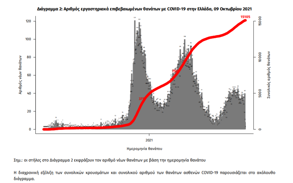 Οι νέοι θάνατοι ασθενών με COVID-19 είναι 36, ενώ από την έναρξη της επιδημίας έχουν καταγραφεί συνολικά 15.105 θάνατοι.Το 95.3% είχε υποκείμενο νόσημα ή/και ηλικία 70 ετών και άνω.