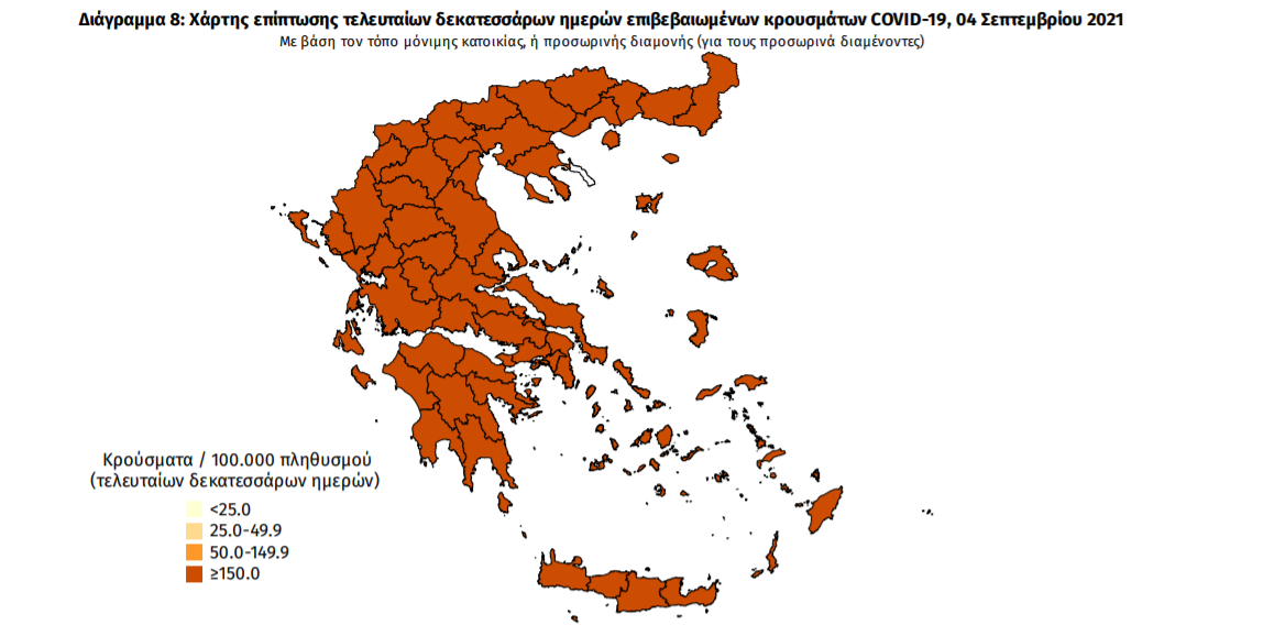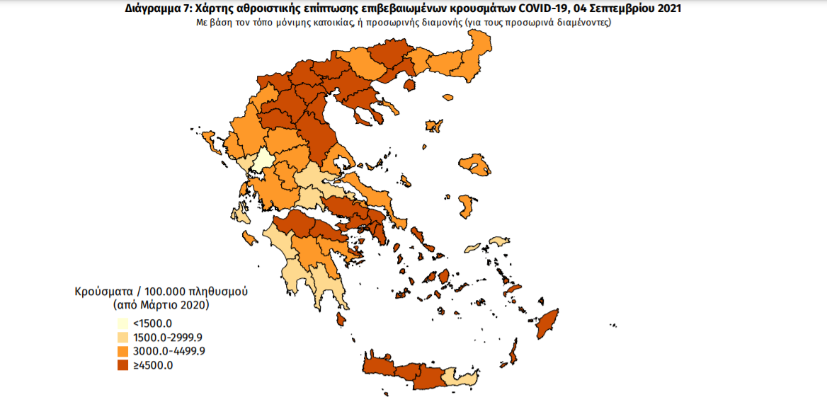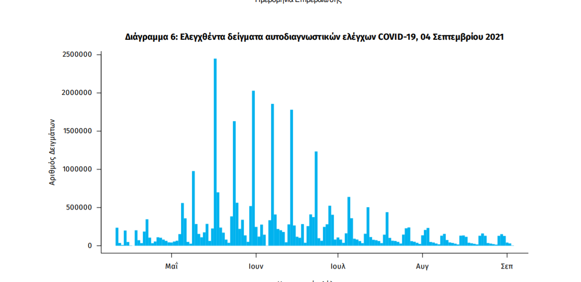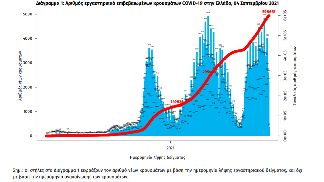Τα νέα εργαστηριακά επιβεβαιωμένα κρούσματα της νόσου που καταγράφηκαν τις τελευταίες 24 ώρες είναι 2.286 , εκ των οποίων 13 εντοπίστηκαν κατόπιν ελέγχων στις πύλες εισόδου της χώρας. Ο συνολικός αριθμός των κρουσμάτων ανέρχεται σε 598.667 (ημερήσια μεταβολή +0.4%), εκ των οποίων 51.0% άνδρες. 1 Με βάση τα επιβεβαιωμένα κρούσματα των τελευταίων 7 ημερών, 161 θεωρούνται σχετιζόμενα με ταξίδι από το εξωτερικό και 1.614 είναι σχετιζόμενα με ήδη γνωστό κρούσμα.