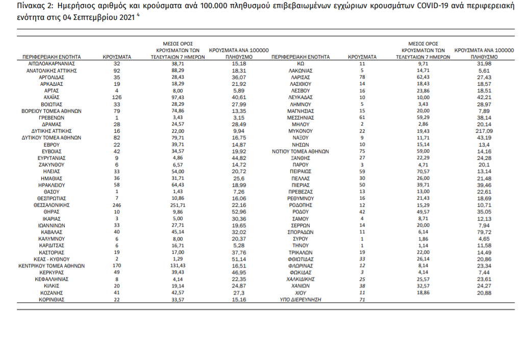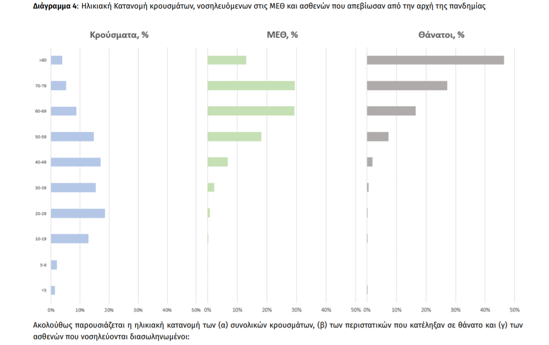 Ο αριθμός των ασθενών που νοσηλεύονται διασωληνωμένοι είναι 381 (60.1% άνδρες). Η διάμεση ηλικία τους είναι 64 έτη. To 82.7% έχει υποκείμενο νόσημα ή/και ηλικία 70 ετών και άνω. Μεταξύ των ασθενών που νοσηλεύονται διασωληνωμένοι, 343 (90.03%) είναι ανεμβολίαστοι ή μερικώς εμβολιασμένοι και 38 (9.97%) είναι πλήρως εμβολιασμένοι. Από την αρχή της πανδημίας έχουν εξέλθει από τις ΜΕΘ 2.998 ασθενείς. Οι εισαγωγές2 νέων ασθενών Covid-19 στα νοσοκομεία της επικράτειας είναι 201 (ημερήσια μεταβολή -18.29%). Ο μέσος όρος εισαγωγών του επταημέρου είναι 240 ασθενείς.Η διάμεση ηλικία των κρουσμάτων είναι 39 έτη (εύρος 0.2 έως 106 έτη), ενώ η διάμεση ηλικία των θανόντων είναι 78 έτη (εύρος 0.2 έως 106 έτη).
