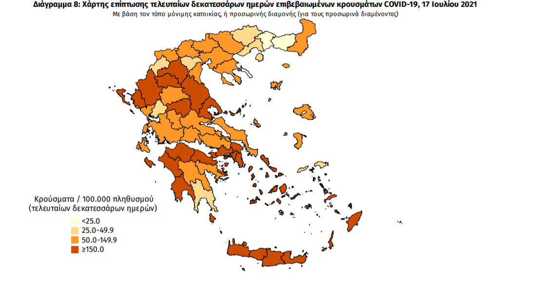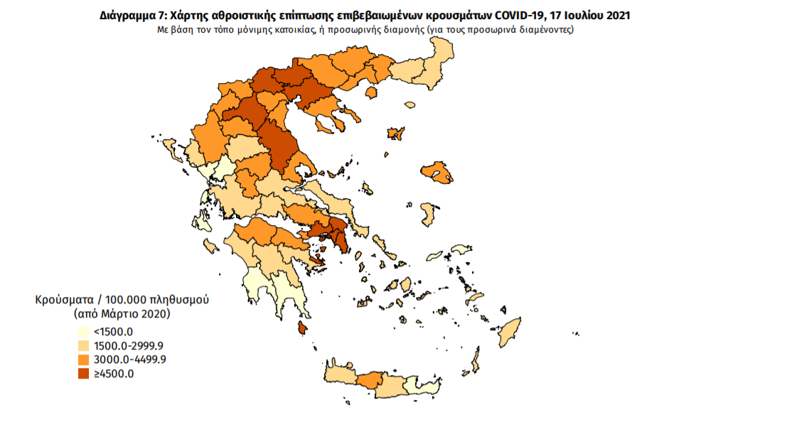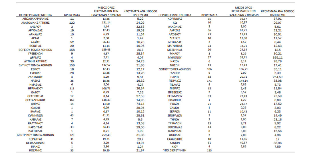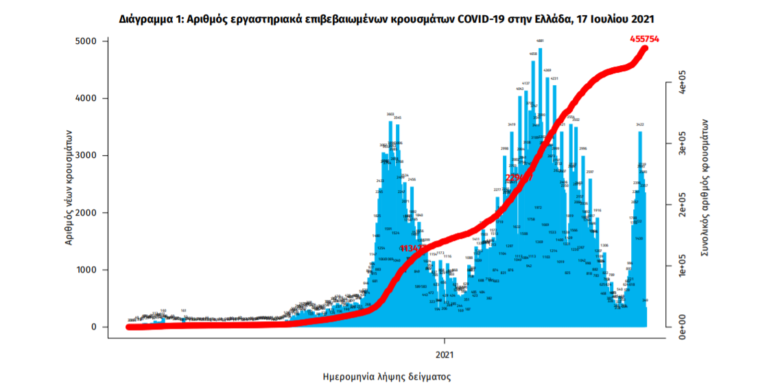 Τα νέα εργαστηριακά επιβεβαιωμένα κρούσματα της νόσου που καταγράφηκαν τις τελευταίες 24 ώρες είναι 2.562 , εκ των οποίων 8 εντοπίστηκαν κατόπιν ελέγχων στις πύλες εισόδου της χώρας. Ο συνολικός αριθμός των κρουσμάτων ανέρχεται σε 455.754 (ημερήσια μεταβολή +0.6%), εκ των οποίων 51.2% άνδρες. 1 Με βάση τα επιβεβαιωμένα κρούσματα των τελευταίων 7 ημερών, 156 θεωρούνται σχετιζόμενα με ταξίδι από το εξωτερικό και 1.705 είναι σχετιζόμενα με ήδη γνωστό κρούσμα.