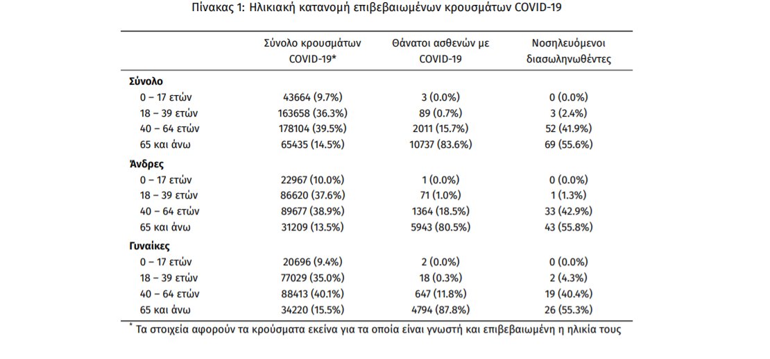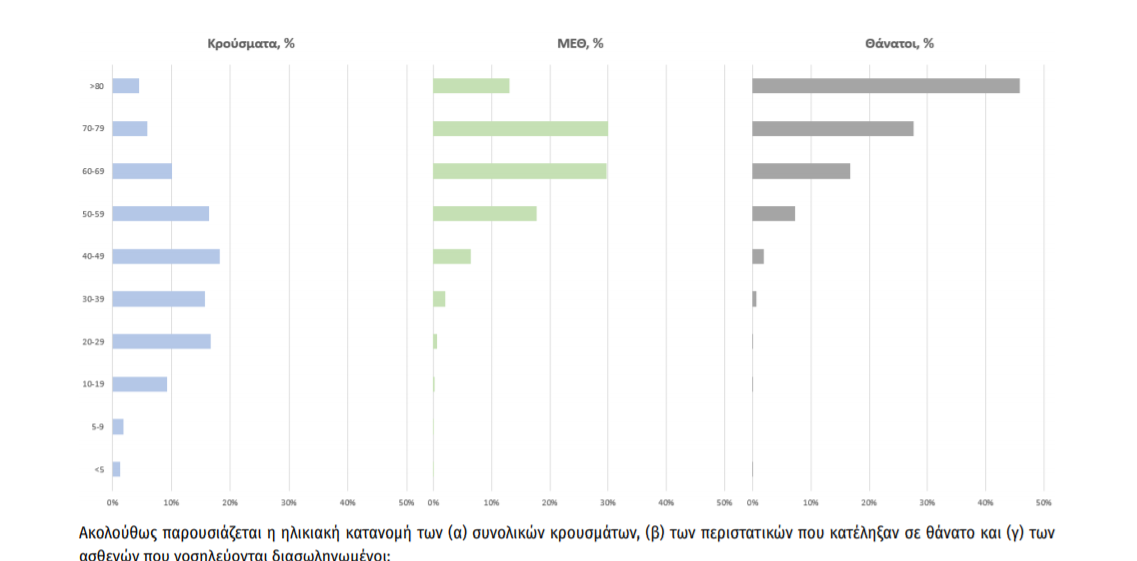 Ο αριθμός των ασθενών που νοσηλεύονται διασωληνωμένοι είναι 124 (62.1% άνδρες). Η διάμεση ηλικία τους είναι 66 έτη. To 87.1% έχει υποκείμενο νόσημα ή/και ηλικία 70 ετών και άνω. Από την αρχή της πανδημίας έχουν εξέλθει από τις ΜΕΘ 2.752 ασθενείς. Οι εισαγωγές2 νέων ασθενών Covid-19 στα νοσοκομεία της επικράτειας είναι 122 (ημερήσια μεταβολή +20.79%). Ο μέσος όρος εισαγωγών του επταημέρου είναι 100 ασθενείς.Η διάμεση ηλικία των κρουσμάτων είναι 42 έτη (εύρος 0.2 έως 106 έτη), ενώ η διάμεση ηλικία των θανόντων είναι 78 έτη (εύρος 0.2 έως 106 έτη)