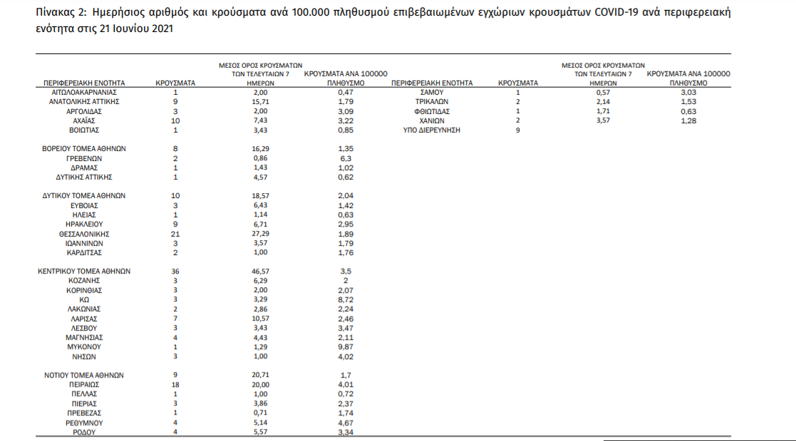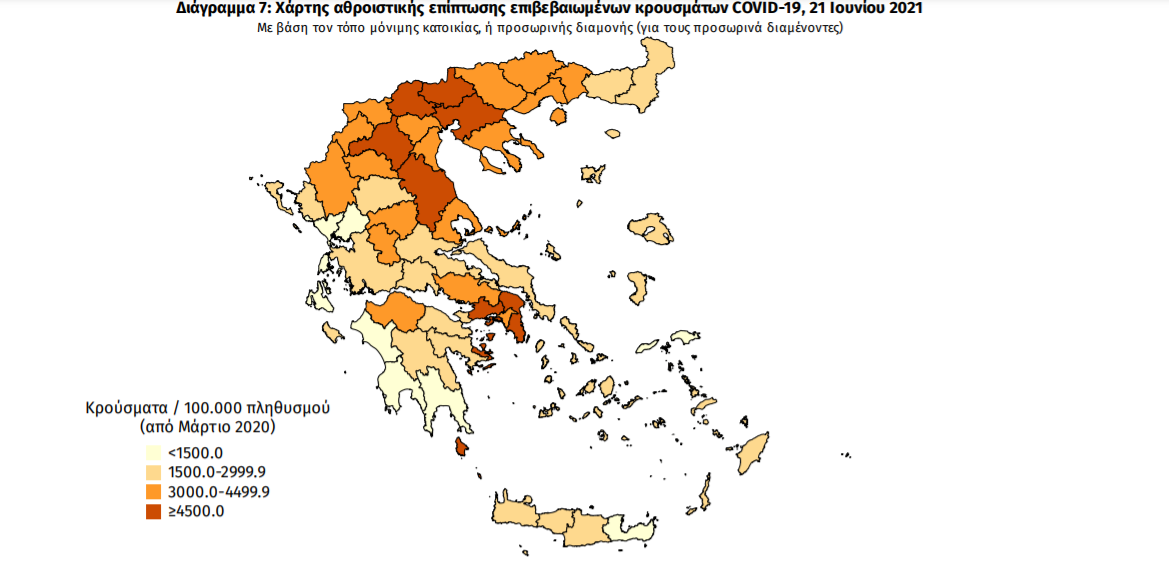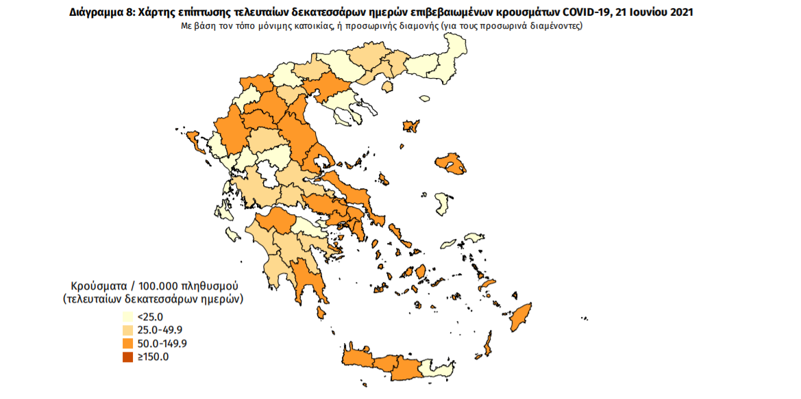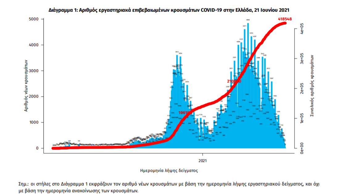 Τα νέα εργαστηριακά επιβεβαιωμένα κρούσματα της νόσου που καταγράφηκαν τις τελευταίες 24 ώρες είναι 209, εκ των οποίων 4 εντοπίστηκαν κατόπιν ελέγχων στις πύλες εισόδου της χώρας. Ο συνολικός αριθμός των κρουσμάτων ανέρχεται σε 418.548 (ημερήσια μεταβολή +0.0%), εκ των οποίων 51.2% άνδρες. 1 Με βάση τα επιβεβαιωμένα κρούσματα των τελευταίων 7 ημερών, 32 θεωρούνται σχετιζόμενα με ταξίδι από το εξωτερικό και 672 είναι σχετιζόμενα με ήδη γνωστό κρούσμα.